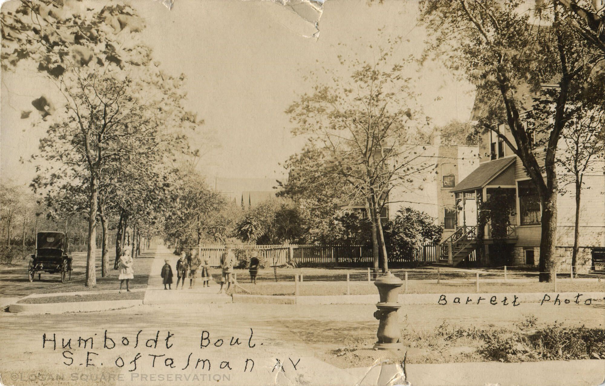 Real-photo postcard view looking east from corner of Logan Boulevard and Talman, with group of children on sidewalk in front of no-longer-extant house at 2623 W. Logan Blvd, circa 1910Subject