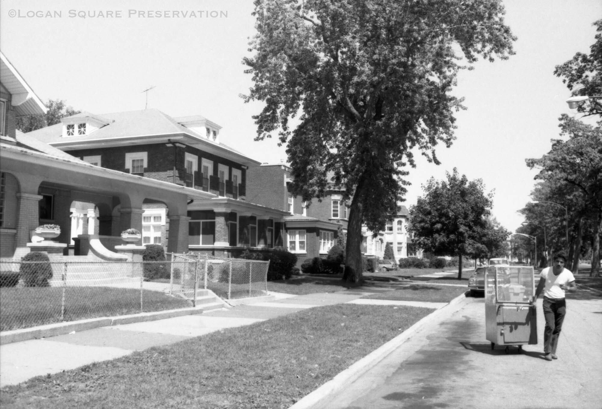 News photo image looking north on Humboldt Boulevard with street vendor walking past 2040 N. Humboldt, taken for Aug 13, 1985 Sun-Times article about new designation of Boulevard Historic DistrictPhotograph Details