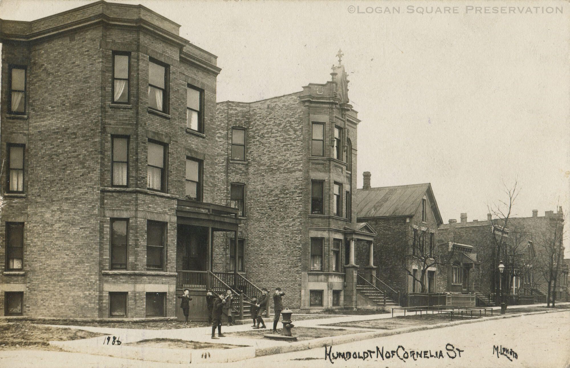 Real-photo postcard view looking northwest at brick 3-flats on 900 block of N. Richmond St (formerly Humboldt St) and Walton (formerly Cornelia St), circa 1909. Boys playing baseball and clowning for photographer near fire hydrant.Subject Place