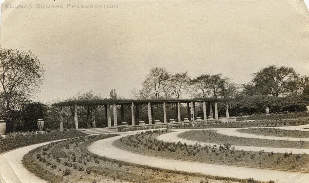Snapshot photo looking across Humboldt Park sunken garden to pergola on west side of garden and gardener in distance tilling flower beds in late spring, circa 1920Photograph Details