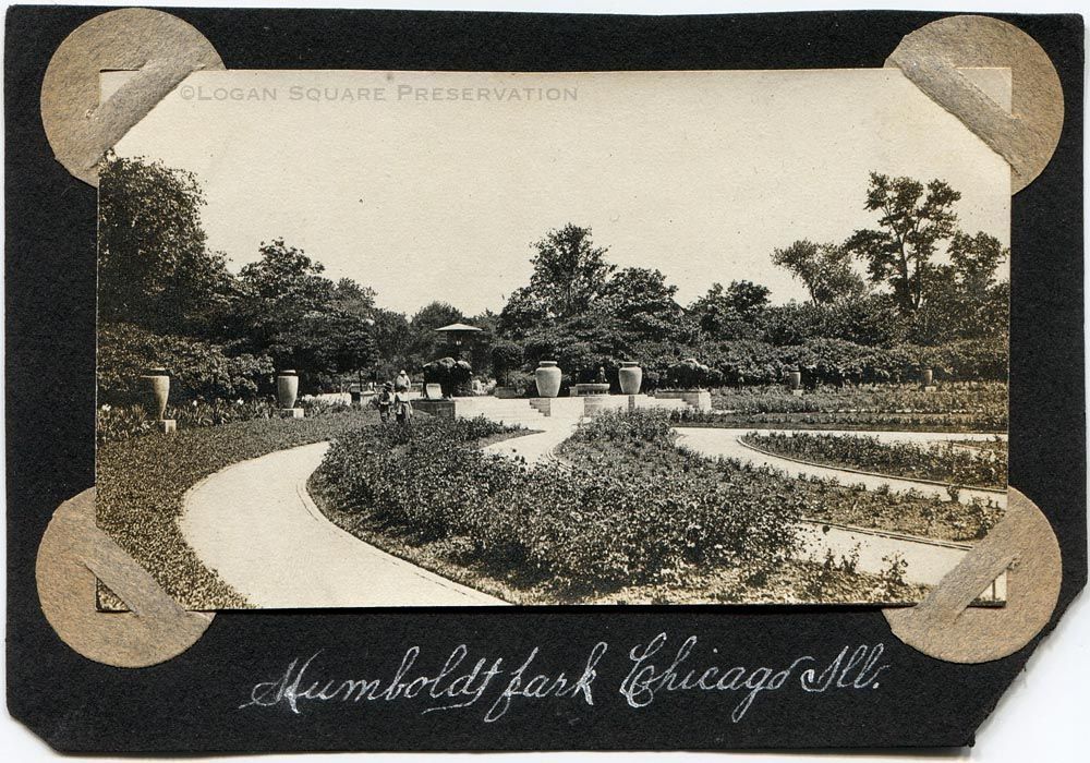 Snapshot photo attached by photo corners to scrap of photo album page with title in white ink, looking southeast along curved path in Humboldt Park sunken garden toward urns and bronze bison at entrance to garden, circa 1920Photograph Details