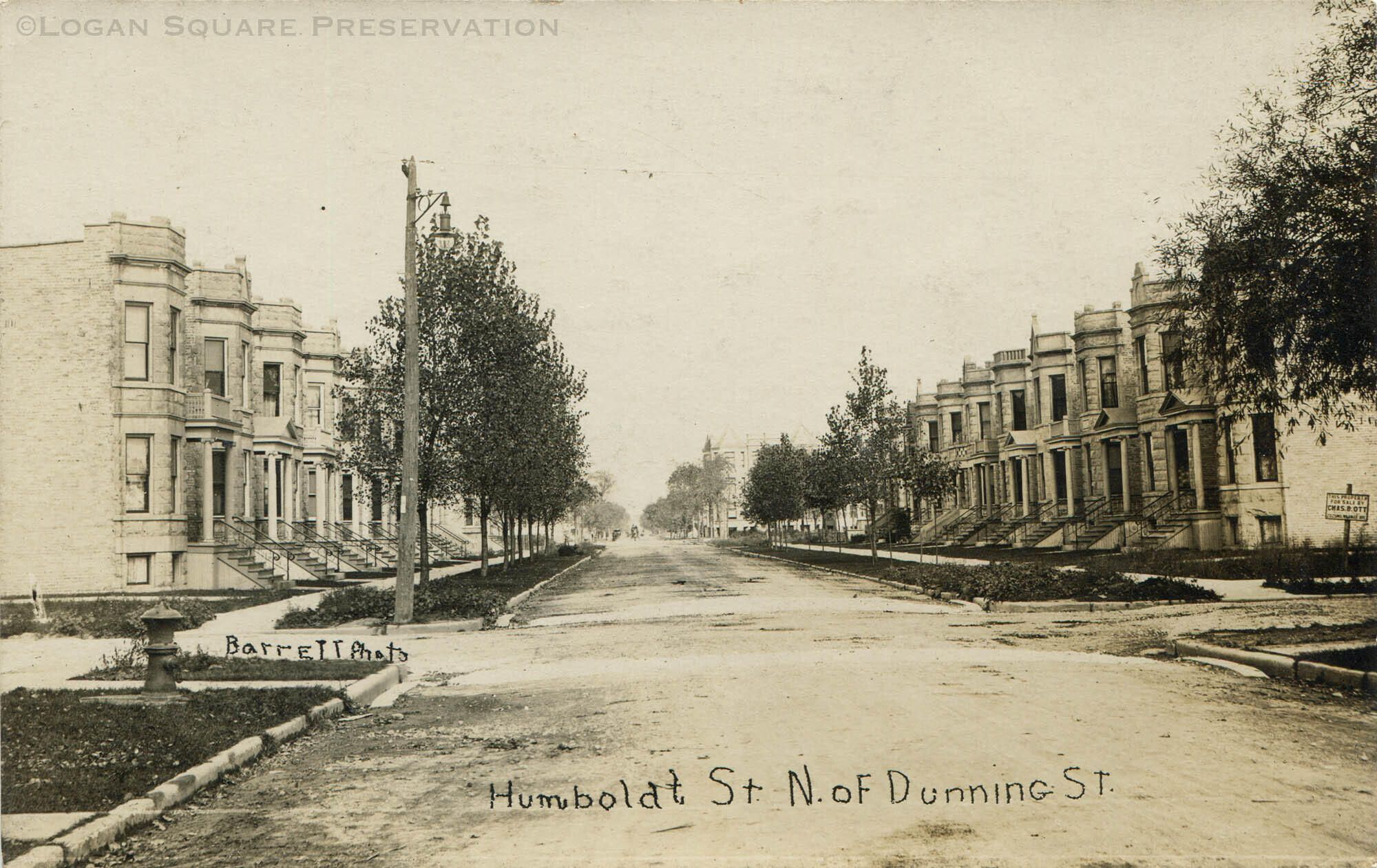Real photo postcard view looking north from Altgeld St (formerly Dunning St) toward greystone 2-flats lining both sides of 2500 block of Richmond St (formerly Humboldt St), circa 1910s. Sign advertising property for sale by real estate agent Charles Ott at right.Subject Place