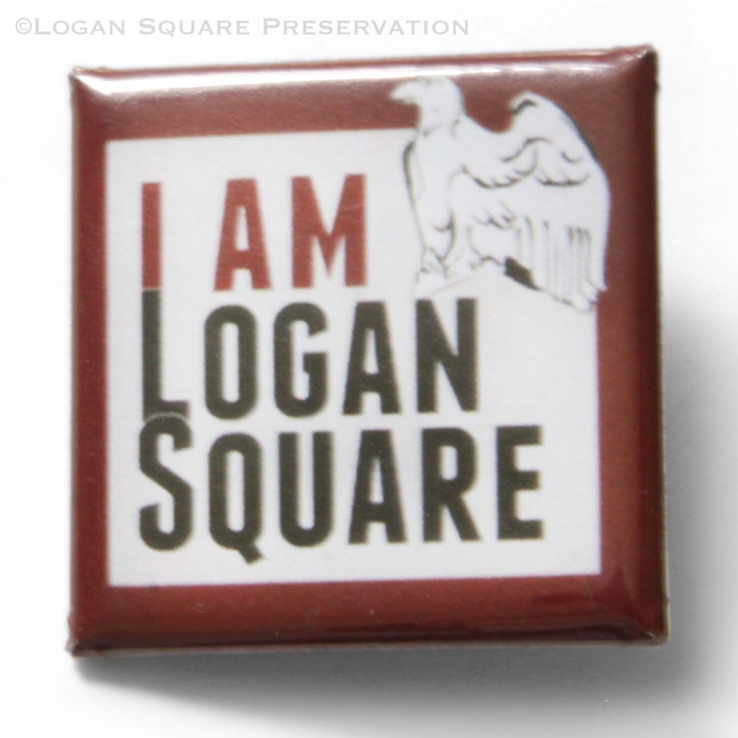 1" square pinback button with I Am Logan Square logo, circa 2010s
