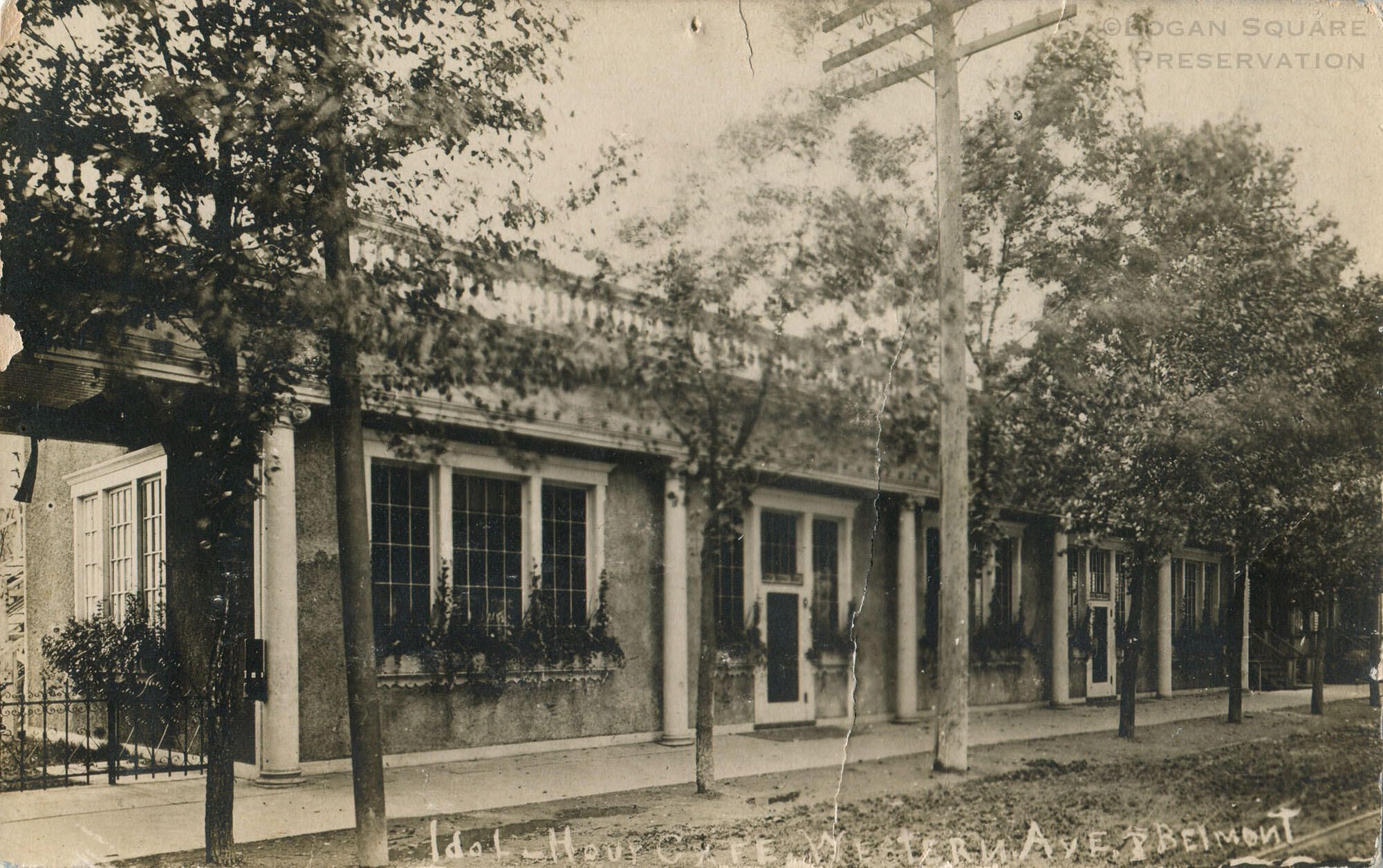 Real-photo postcard view looking northeast at 1-story restaurant near corner of Belmont & Western Aves, circa 1909Subject Person/Organization