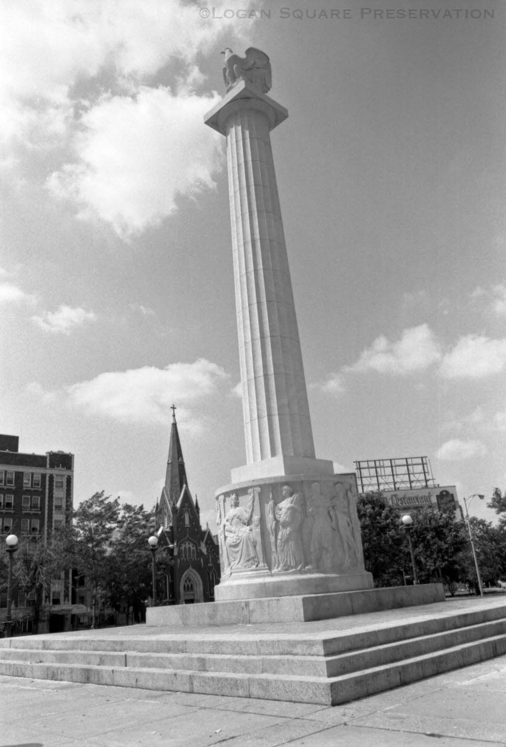 Black and white 35mm photograph looking northwest at Illinois Centennial Monument in Logan Square park with Minnekirken and billboards in background, circa 1980sPhotograph Details
