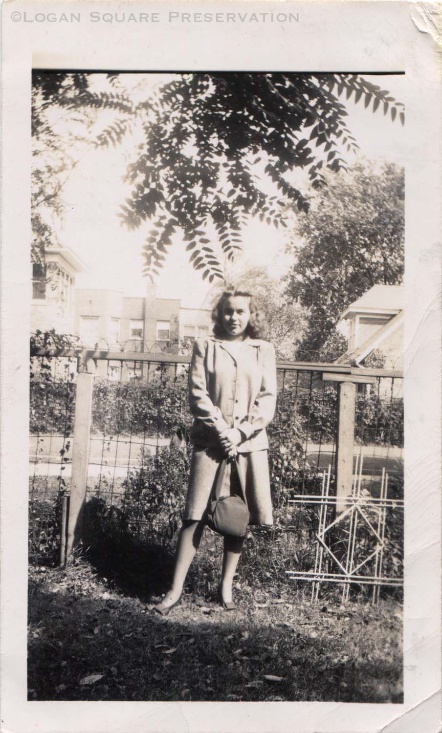 Snapshot photo of Irene Nilsen standing near fence in backyard at 3077 W. Palmer, with back of buildings to east visible in distance, 1945Photograph Details