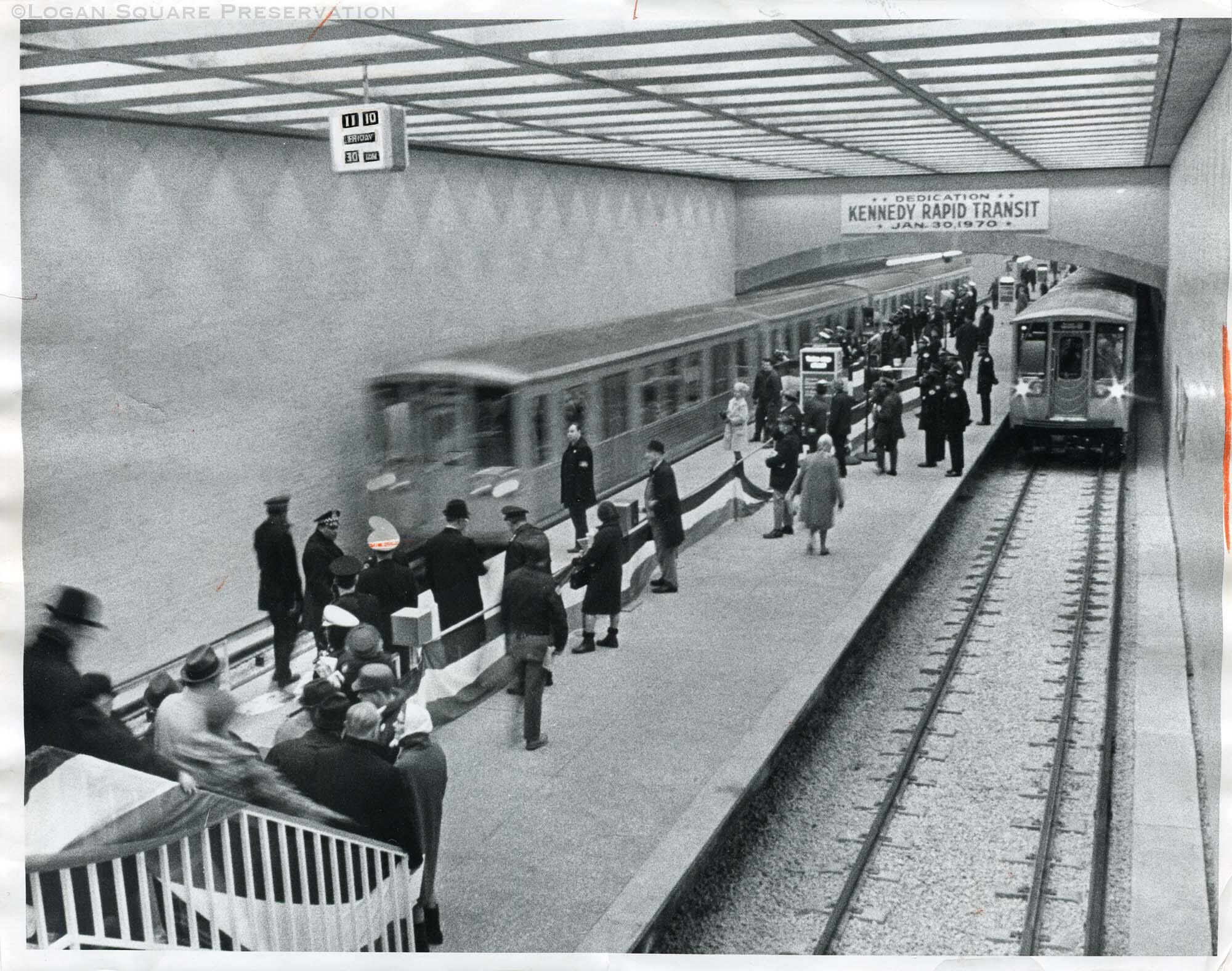 Oversized news photo of crowd on platform of new Logan Square subway platform for inauguration ceremony of service on Blue Line extension to Jefferson Park, Jan 30, 1970Photograph Details