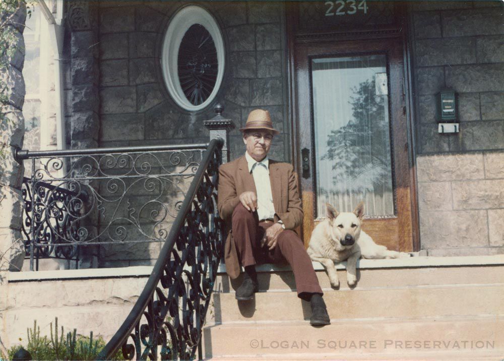 Snapshot portrait of Iwan Heratschenko and dog sitting on step of porch next to cast-iron railing at 2234 N. Kedzie Blvd circa 1970sPhotograph Details