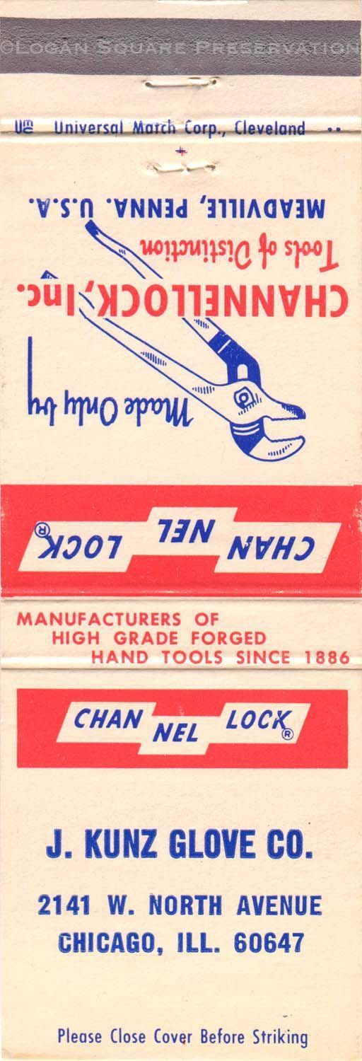 1.5" matchbook for glove manufacturer printed in blue and red ink on cream paper with advertisement for Channellock pliers on back, circa 1950s-1960sPublication Details
