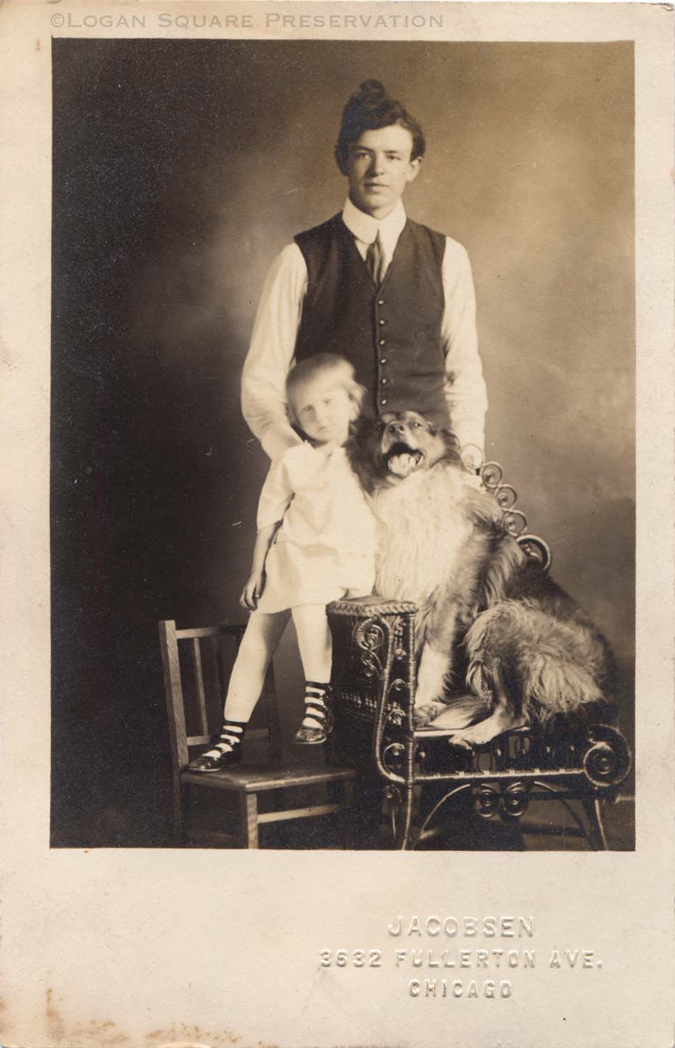 Real-photo postcard portrait of unknown young man in vest with child and dog sitting on chairs, circa 1915Subject Place