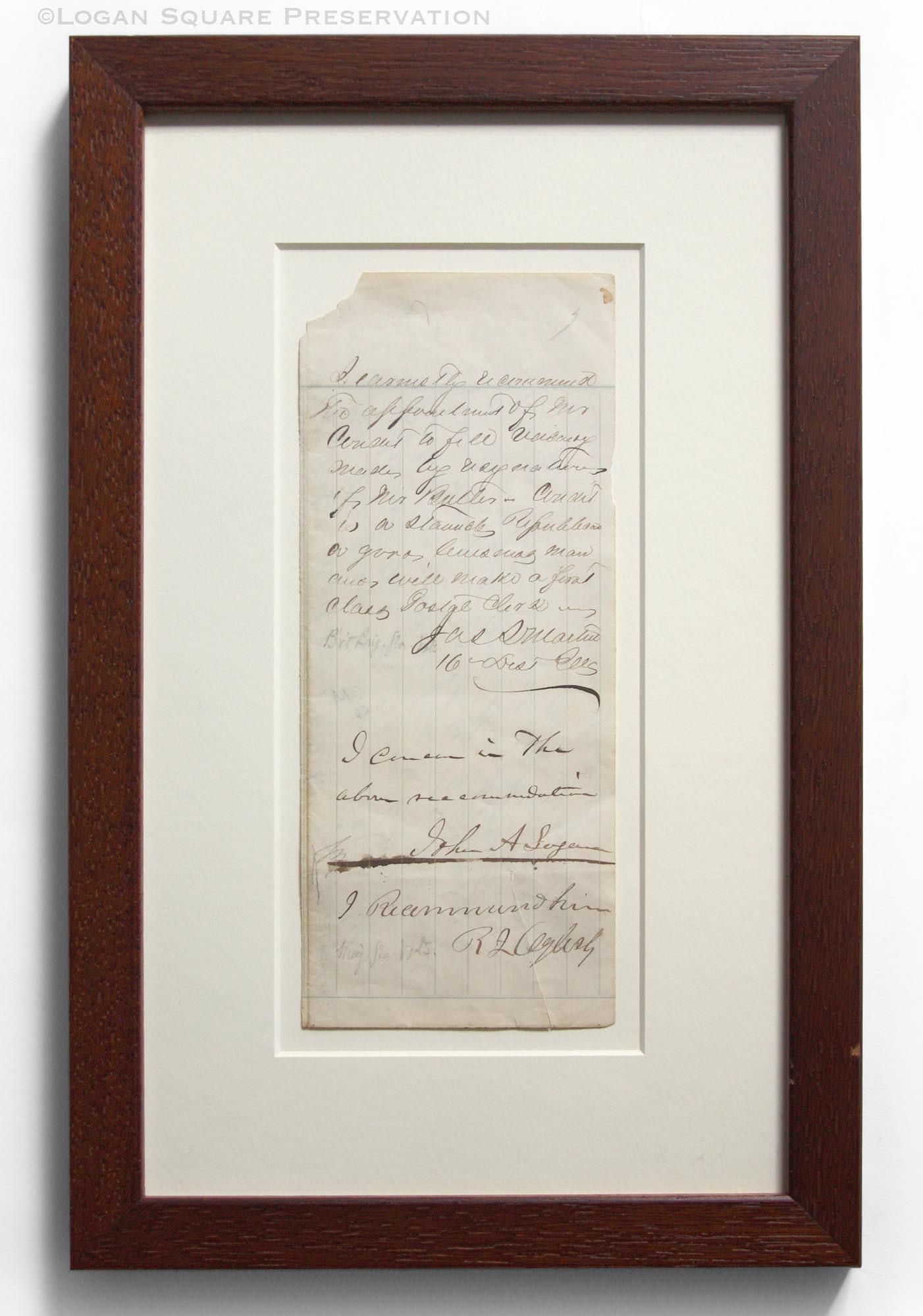 Framed letter of recommendation for Mr. Butler as postal clerk from Joseph S. Martin, with additional endorsements signed by General John. A. Logan and Richard J. OglesbyCollection