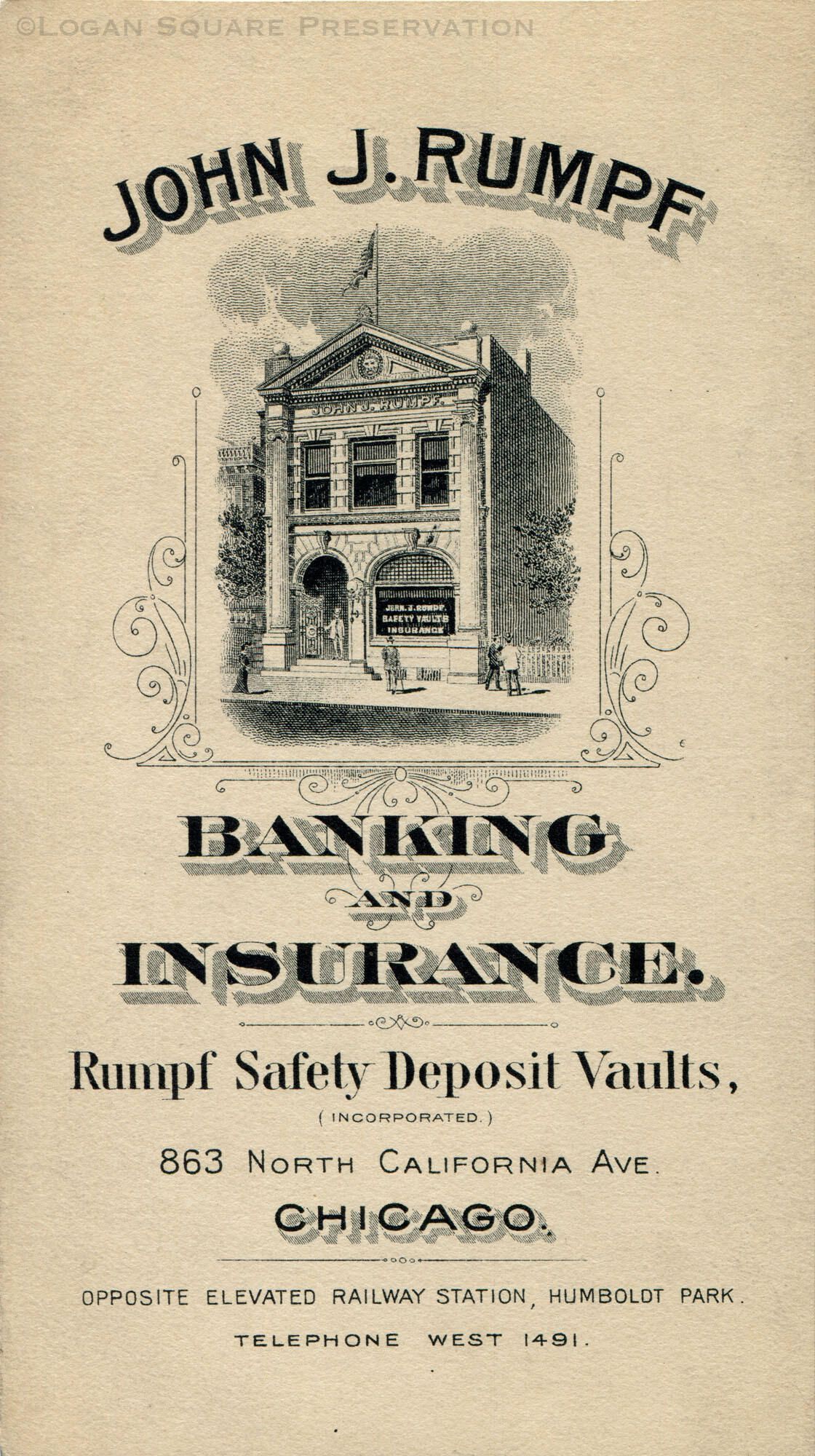 3.5" x 6" pre-1909 trade card advertising John J. Rumpf Banking and Insurance with illustration of buildingRelationships