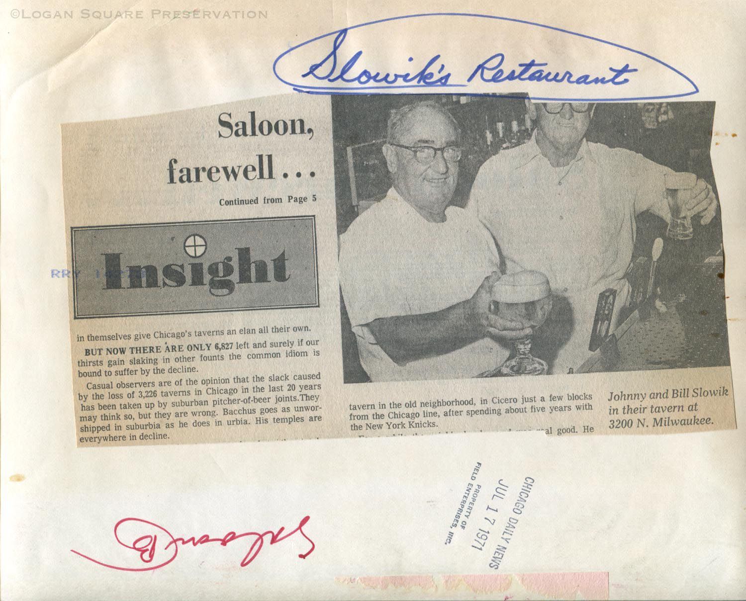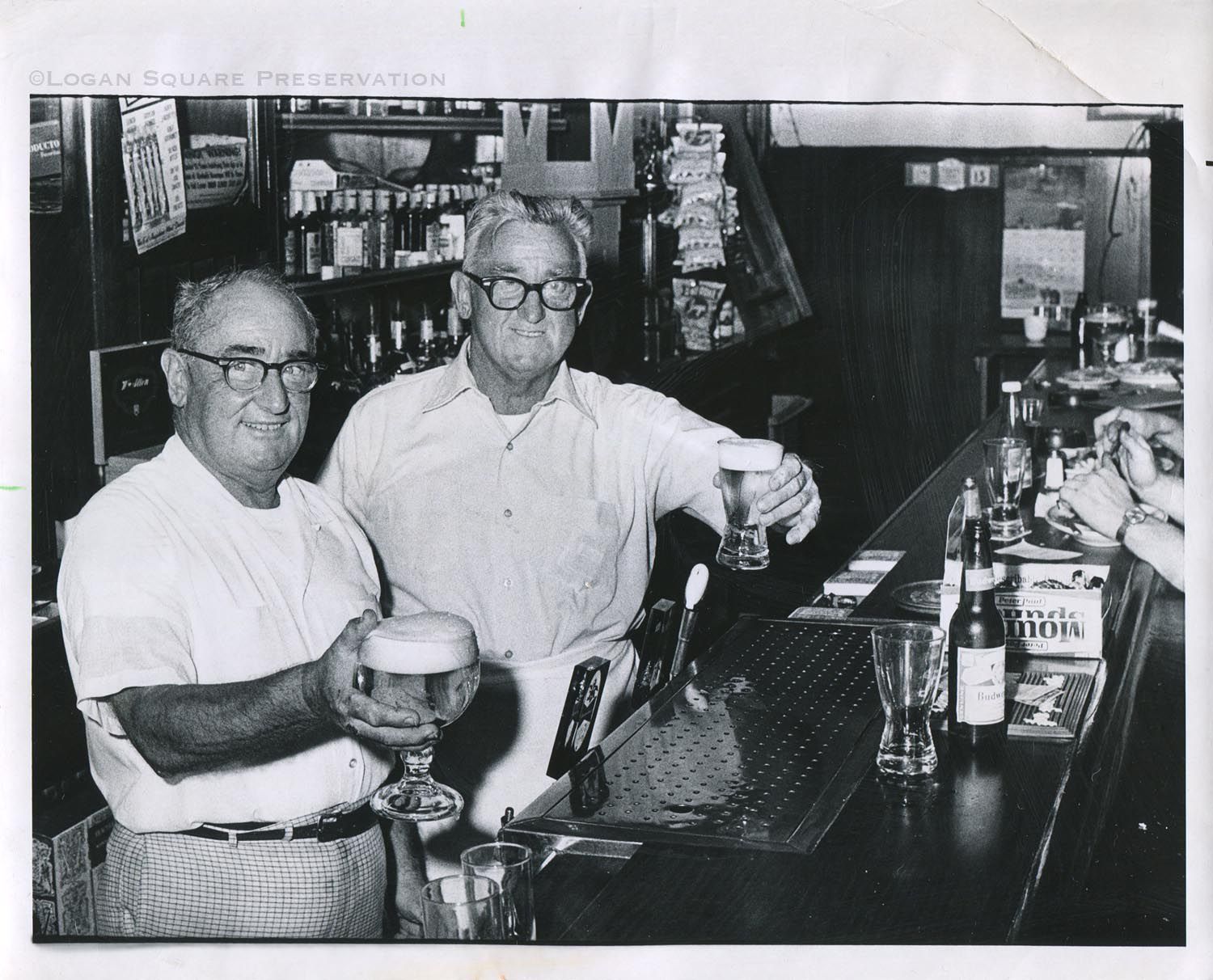 News photo portrait of restaurant-owner brothers Johnny & Bill Slowik raising glasses of beer, for Daily News article about disappearance of neighborhood taverns, 1971Photograph Details