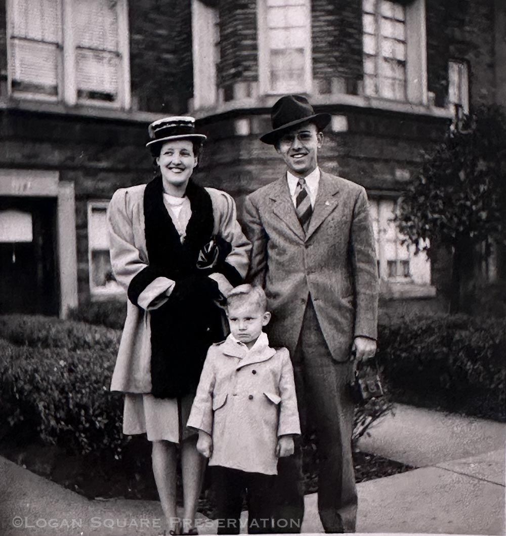 Photo of snapshot of Darlene, Mont & David Johnson standing on sidewalk by hedges in front of apartment building door at 2806 W. Logan Blvd, 1947Photograph Details