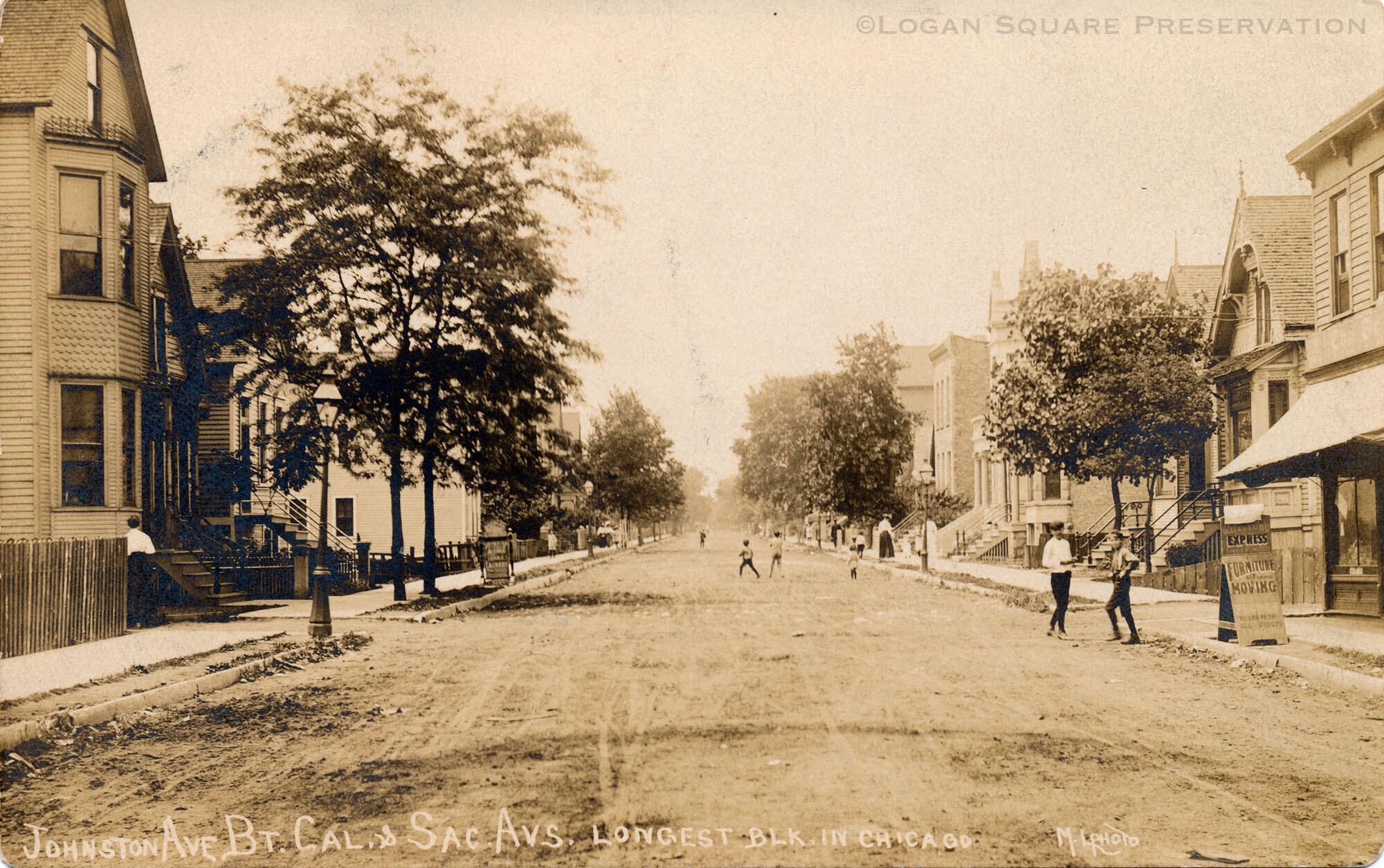 Real-photo postcard view looking west at 2800 block of Lyndale St (formerly Johnston Ave), circa 1910. Children playing ball in street. Signboards for Johnston Avenue Laundry in basement of 2821 W. Lyndale and Oscar Eklund furniture moving in front of former candy shop at 2810 W. Lyndale.Subject