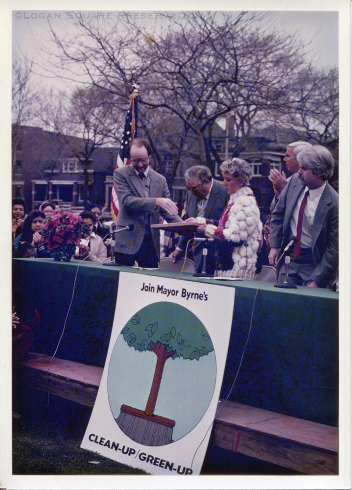 Snapshot photo of Steve Hier receiving plaque from Mayor Jane Byrne on platform set up for press conference in Palmer Square on Arbor Day announcing Mayor Byrne's citywide volunteer spring clean-up blitz, with students from St. Sylvester School in background looking on, 1982Photograph Details