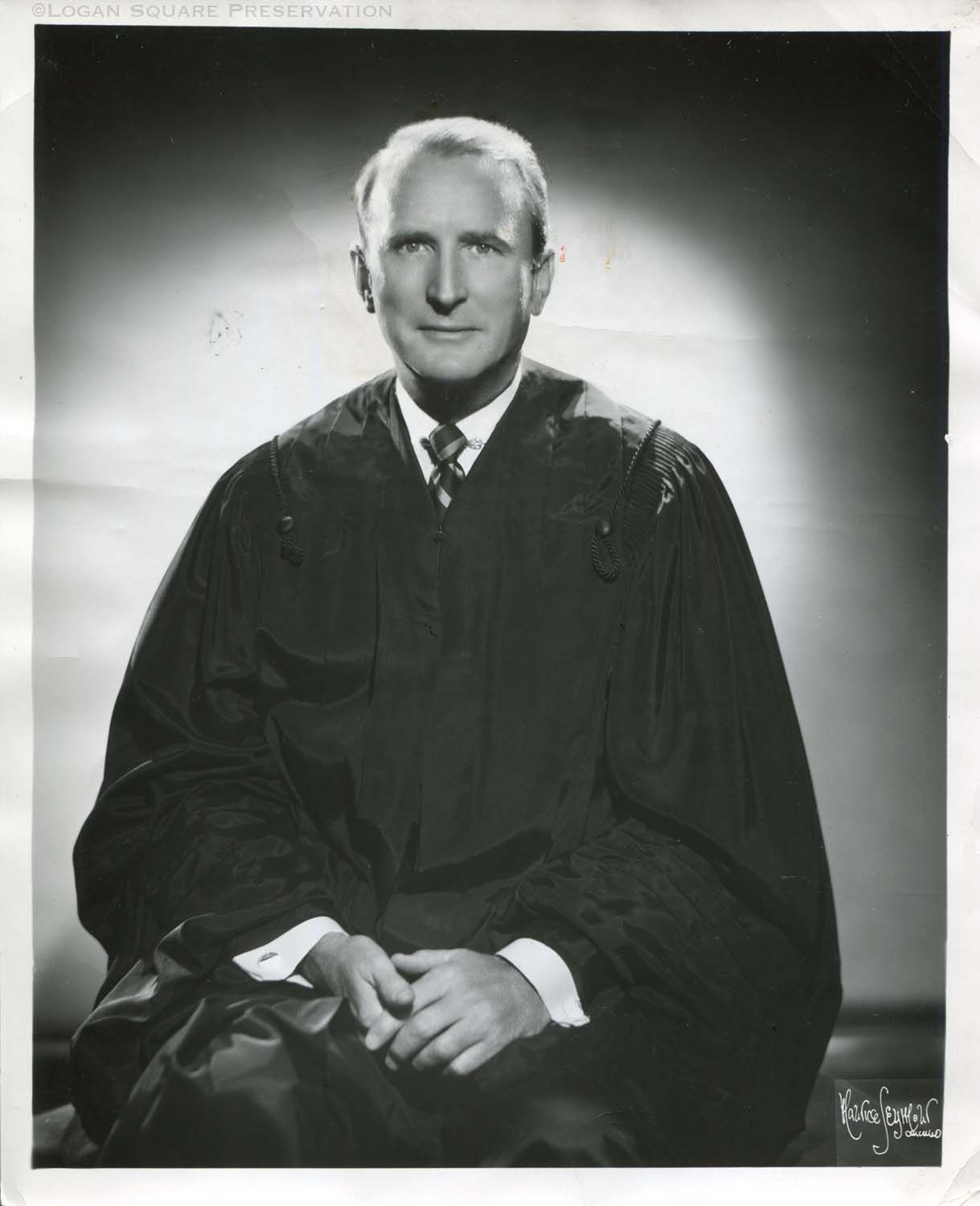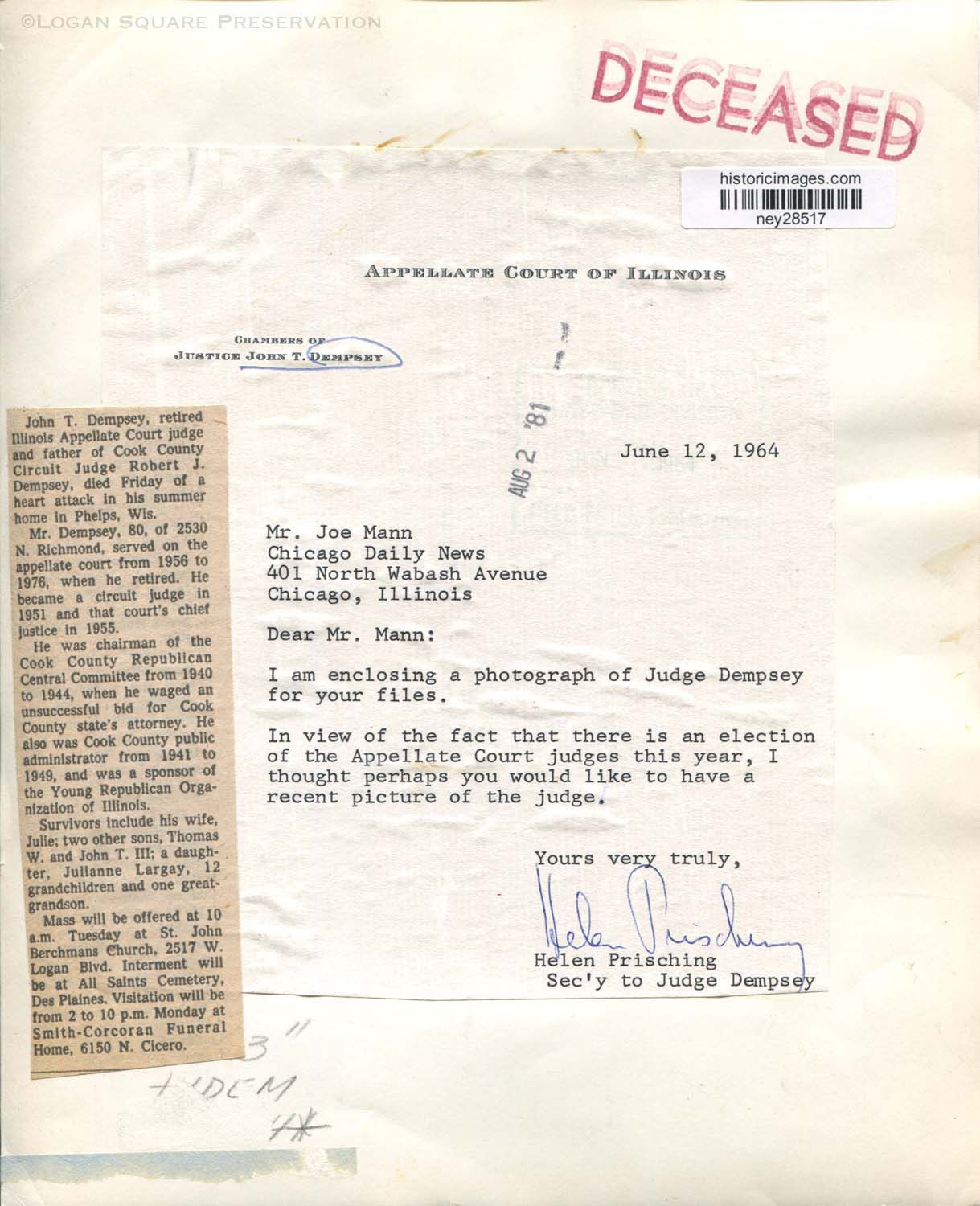 Studio portrait of Illinois Appellate Court judge John T. Dempsey Jr. circa 1964 with 1981 obituary newsclipping on backPhotograph Details