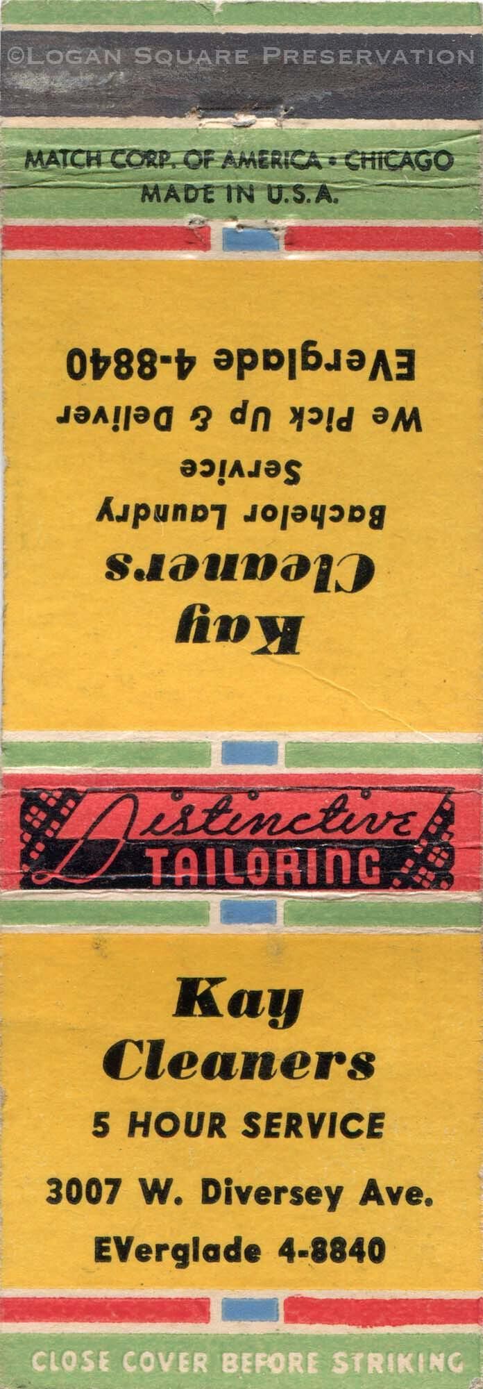 1.5" matchbook for Kay Cleaners laundromat with stock art for "distinctive tailoring" on top, circa 1940sPublication Details