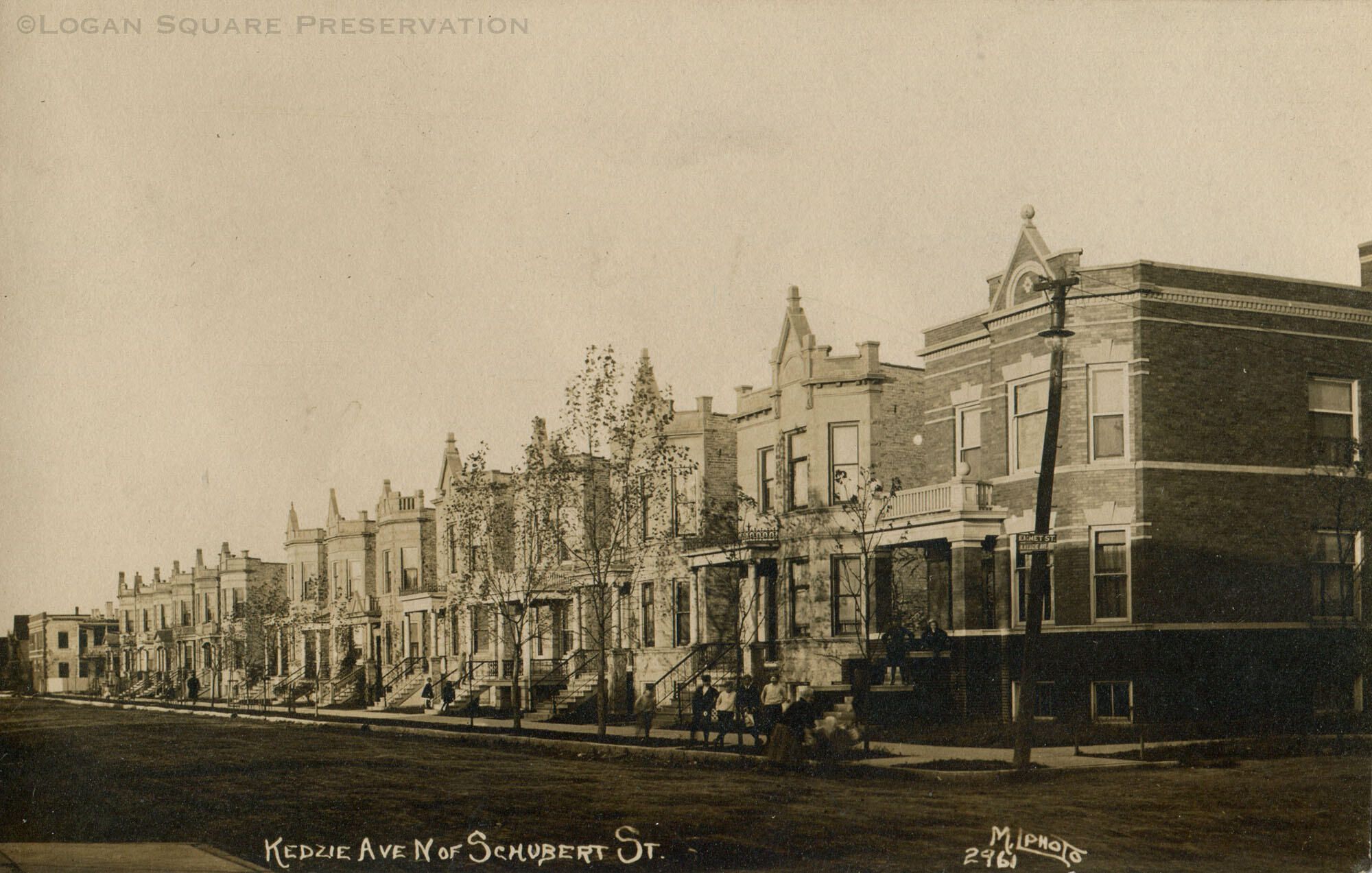 Real-photo postcard view looking northeast at row of brick and greystone 2-flats on 2700 block of N. Kedzie Ave, circa 1910Subject