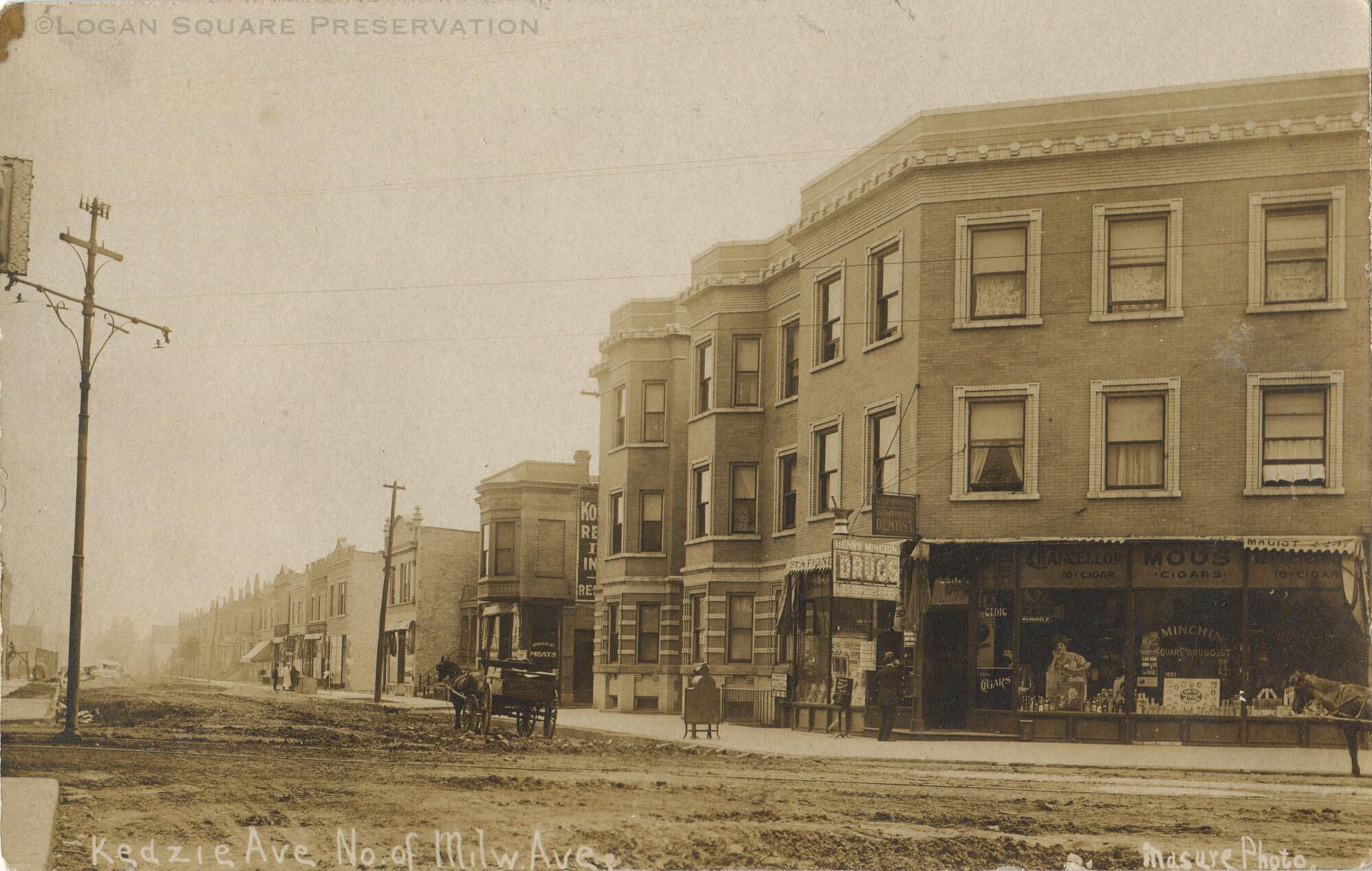 Real-photo postcard view looking northeast from Milwaukee Ave at 3-story corner flats and drugstore and two-flats farther up Kedzie, circa 1907. Delivery wagon parked in muddy street.Subject