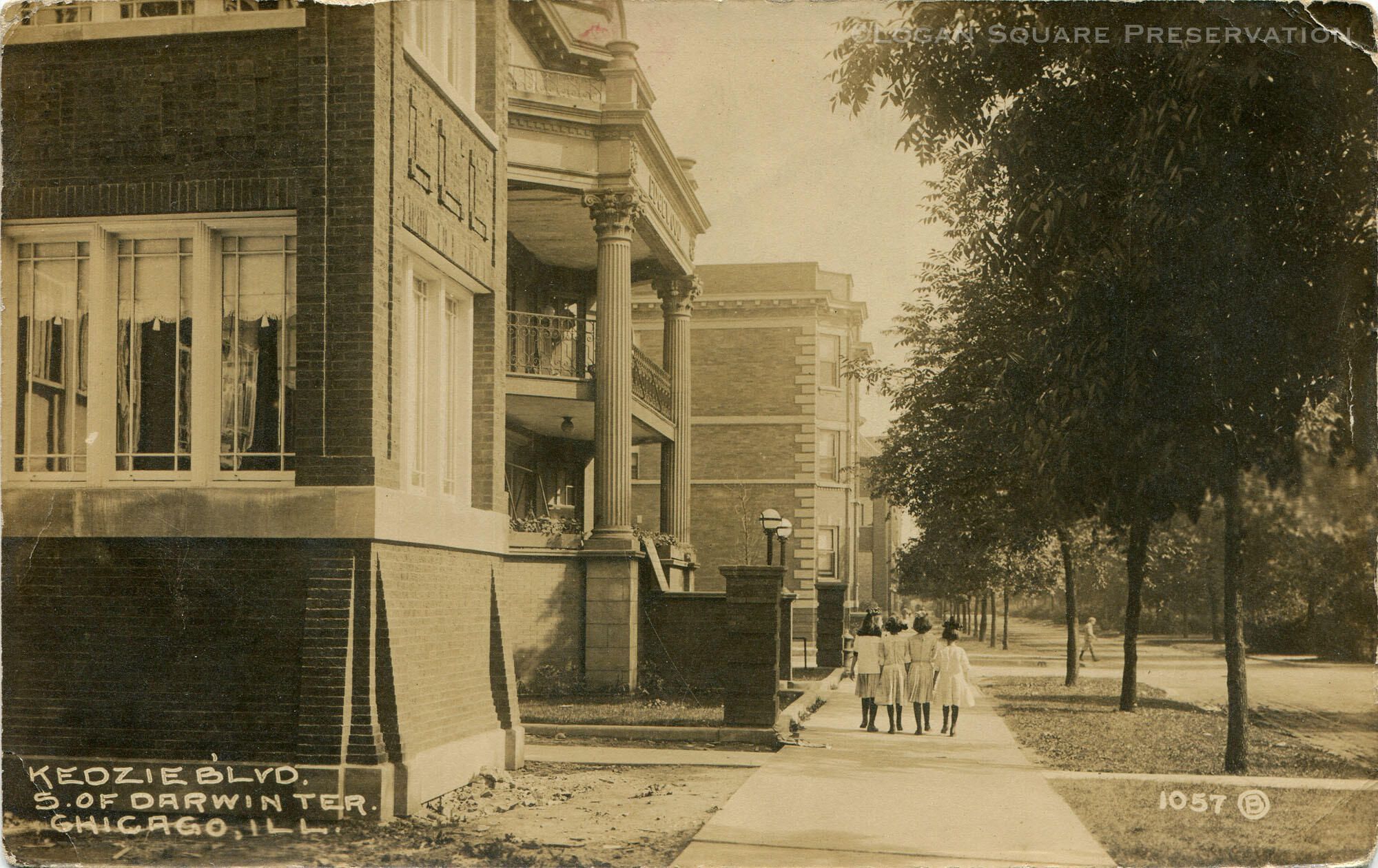 Real-photo postcard view looking south at buildings on west side of Kedzie Blvd with four girls walking down sidewalk, circa 1910Subject
