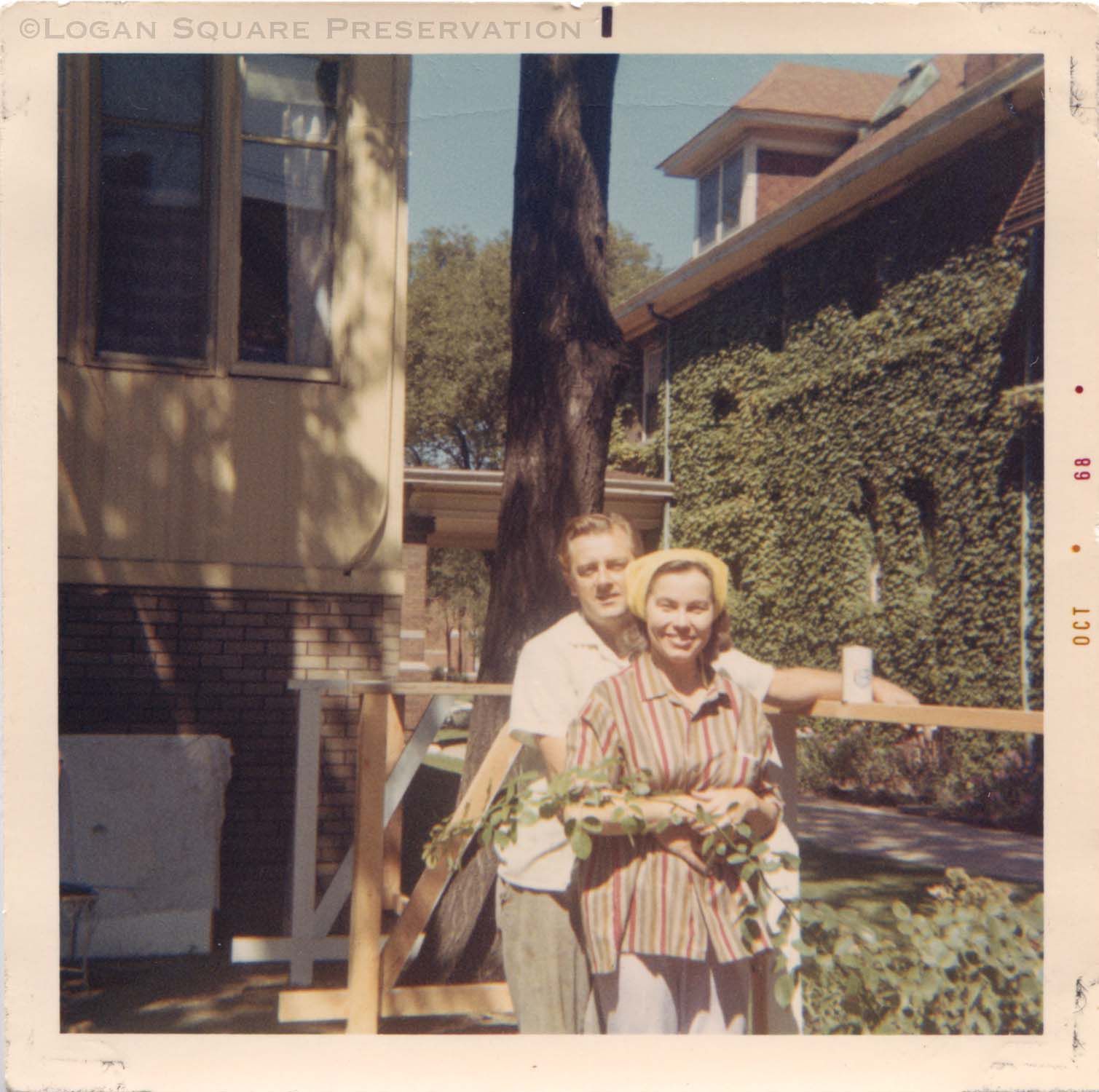 Snapshot photo of Kermit and Pudge Tangeros working on fence in backyard of 3077 W. Palmer Square, summer 1968Photograph Details