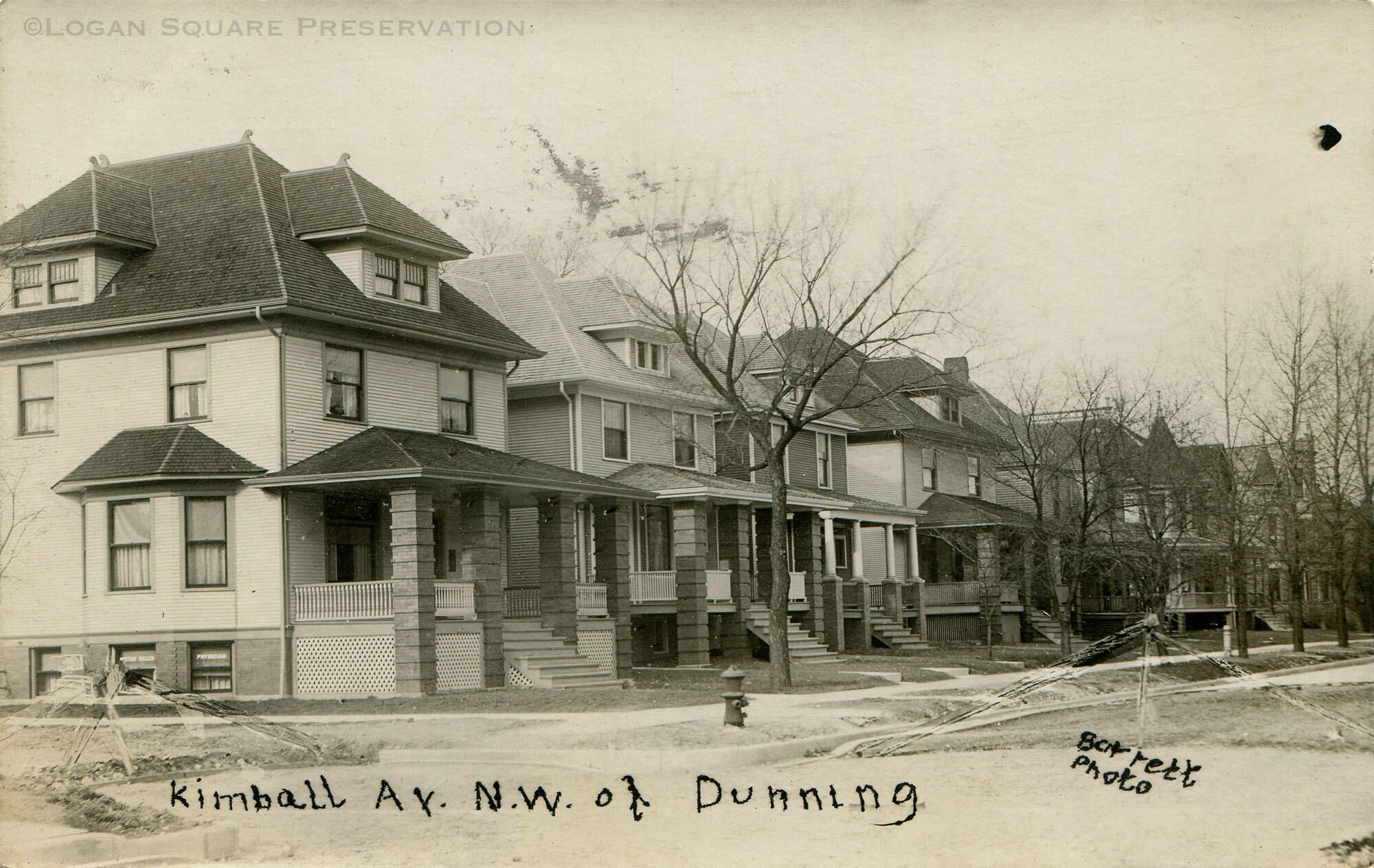 Real photo postcard view looking northwest from corner of Altgeld St (formerly Dunning St) at four-square houses on west side of 2500 block of N. Kimball Ave, circa 1908Subject