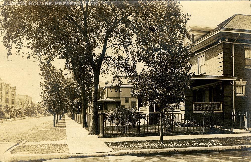 Real-photo postcard view looking south down sidewalk and houses on west side of 2500 block of N. Kimball Ave, circa 1910. C.R. Childs card #2628.Subject Place