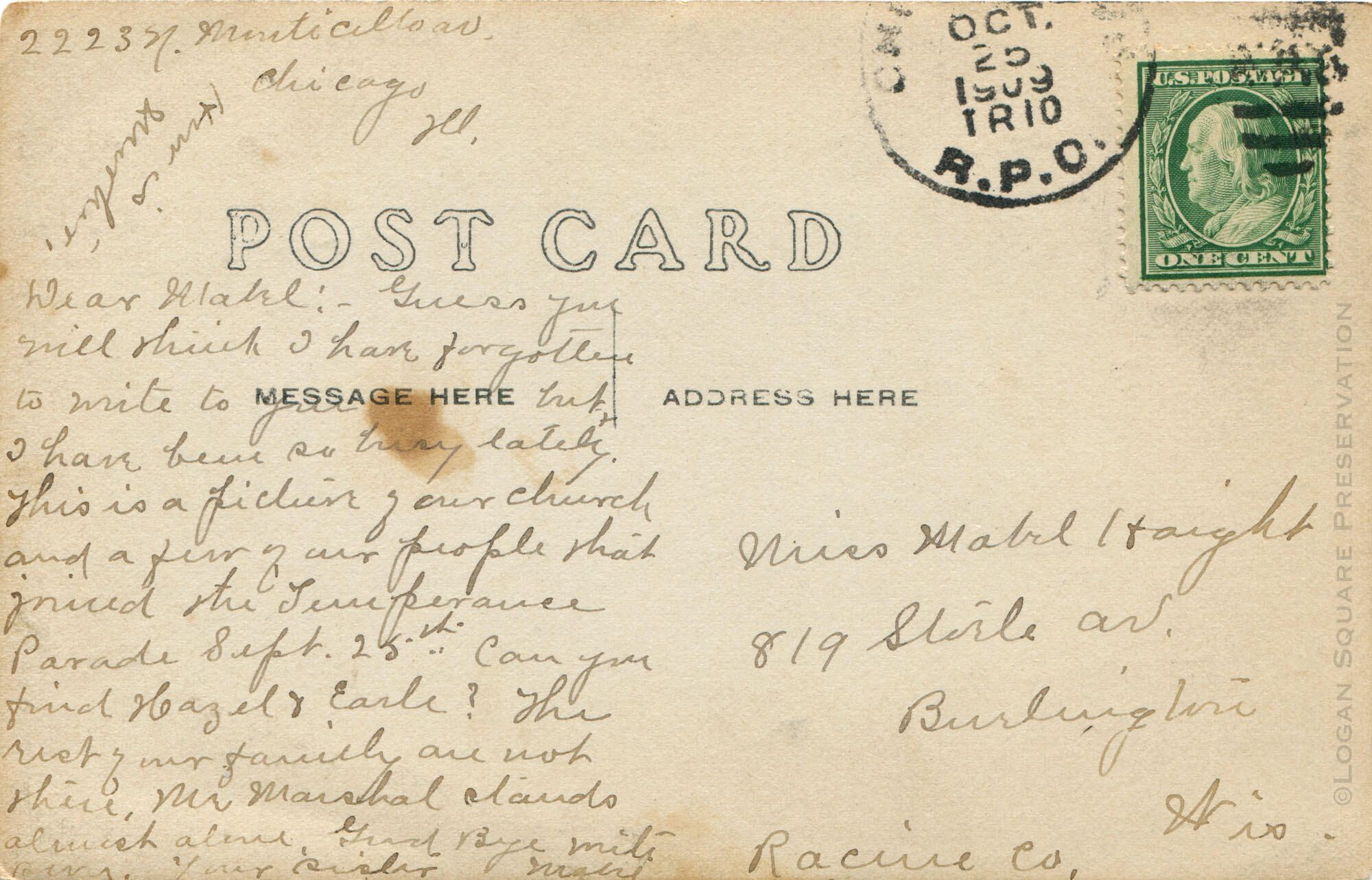 Real-photo postcard view of children and adults who participated in Sept 25, 1909 Temperance Parade standing in front of Kimball Avenue United Evangelical Church, with message on back about parade, sent by Mabel Haight to sister-in-law Mabel Haight on Oct 25, 1909. Duplicate image of card #003-4Subject Person/Organization
