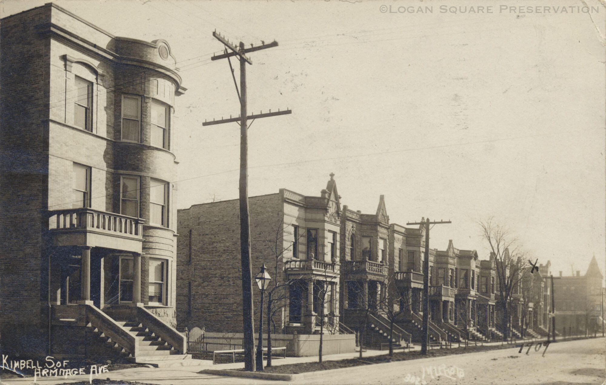 Real-photo postcard view of apartment and two-flats on east side of 1900 block of N. Kimball Ave looking south, circa 1910. House at 1909 N. Kimball marked with "X".Subject