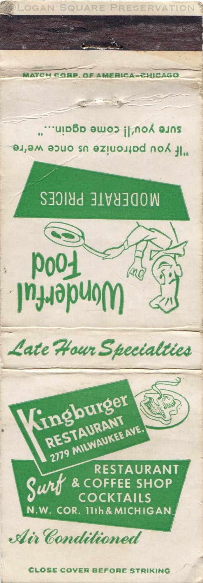 1.5" matchboook printed in green ink on cream paper for Kingburger and Surf restaurants, circa 1960sPublication Details