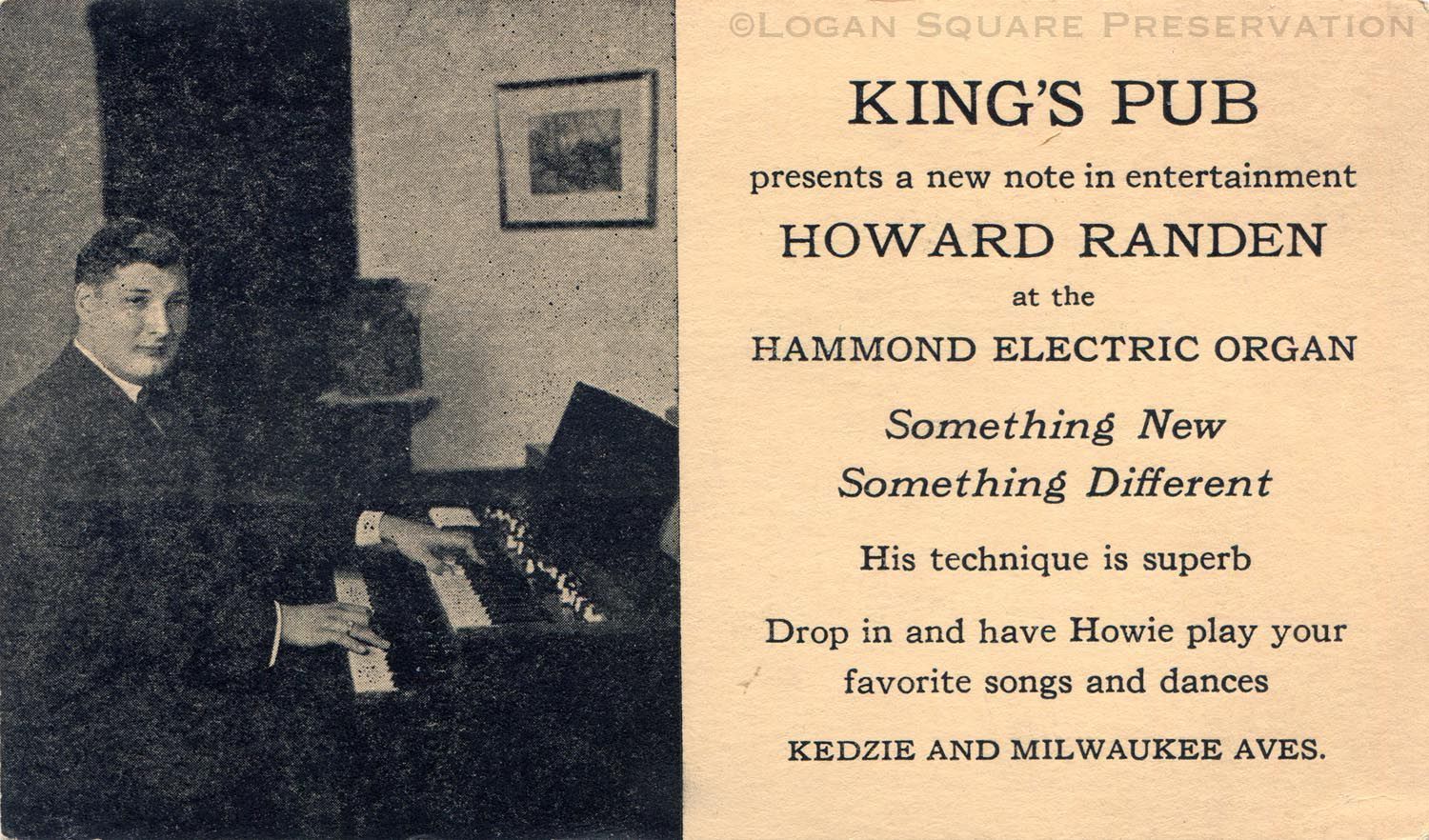 Promotional postal card with photo of "Howie" Randen sitting at electric organ announcing entertainment at King's Pub, circa 1939Subject Person/Organization