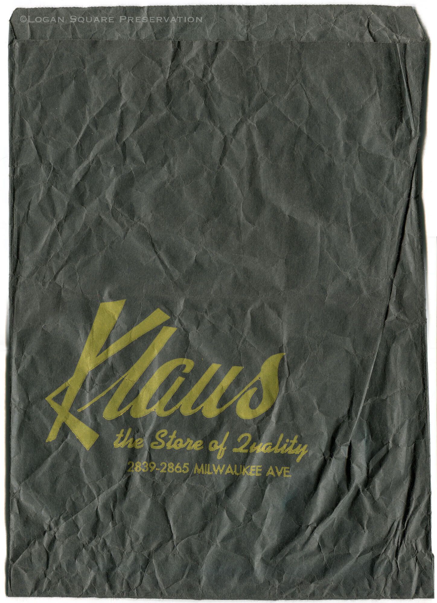 Black paper bag for Klaus department store printed in yellow ink, circa 1960s-70sCollection