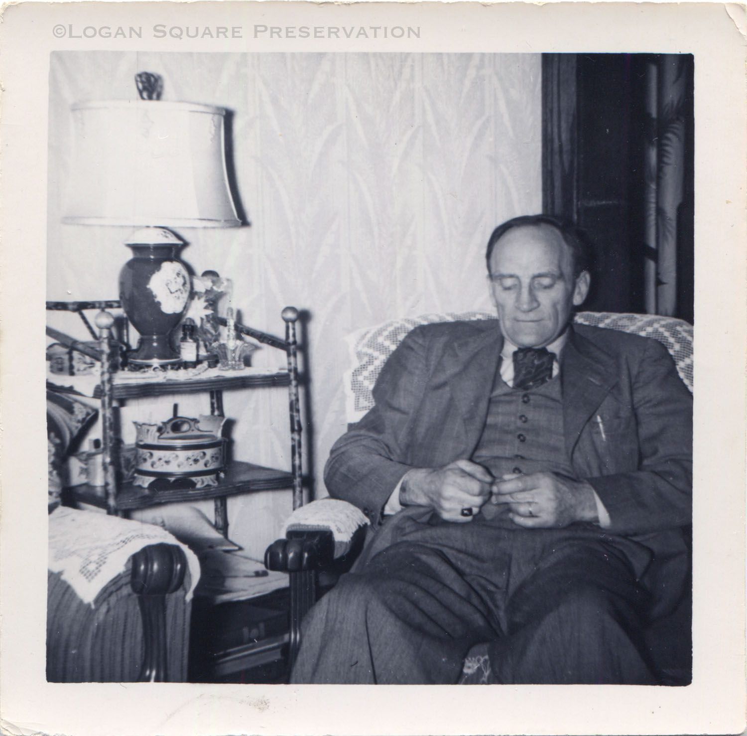 Snapshot photo of Klaus Tangeros sitting in chair with arms covered by Hardanger lace, next to shelf of decorative objects including Norwegian tine box, circa 1950Photograph Details