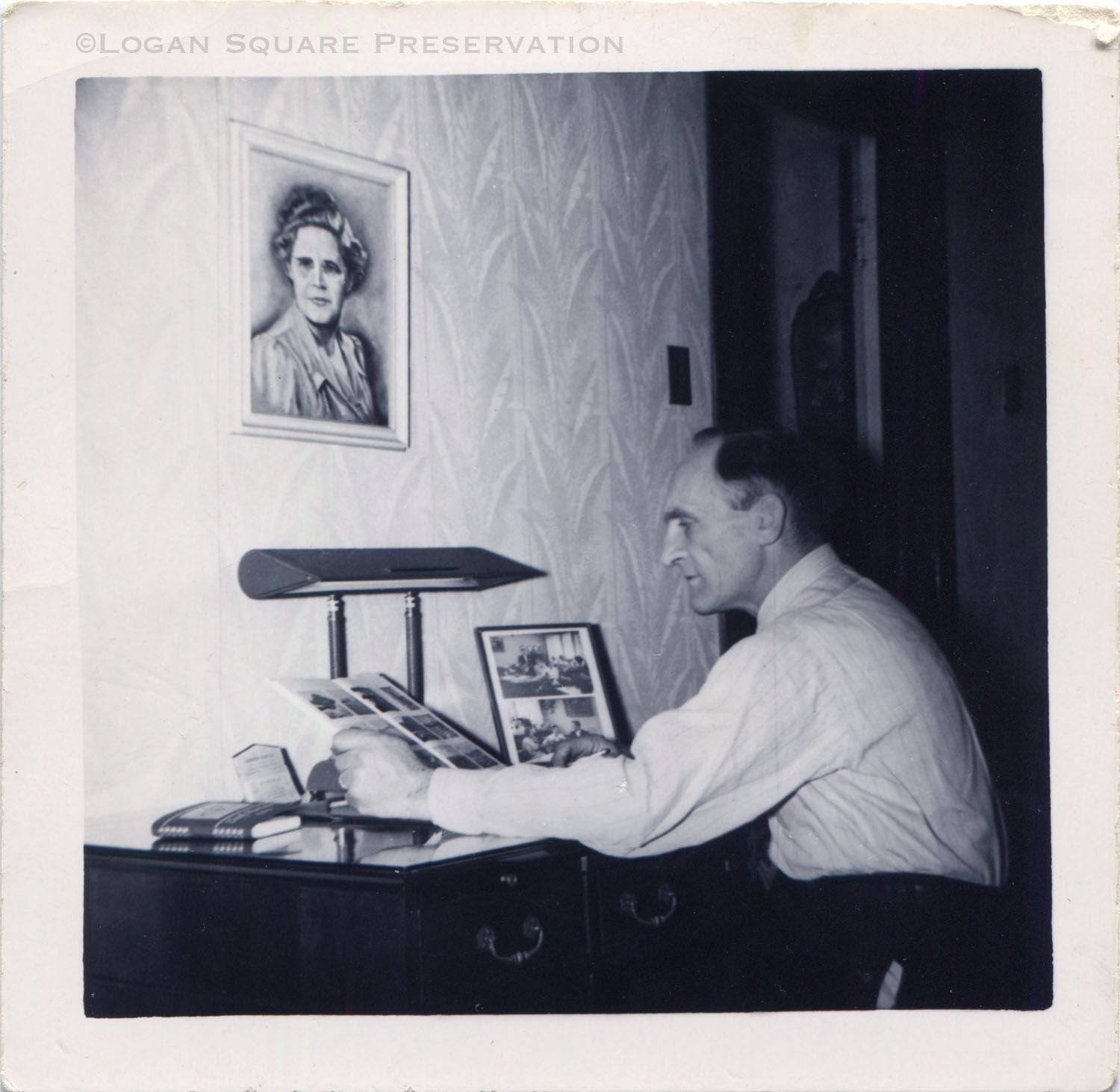Snapshot photo of Klaus Tangeros sitting at desk reading booklet, circa 1950Photograph Details