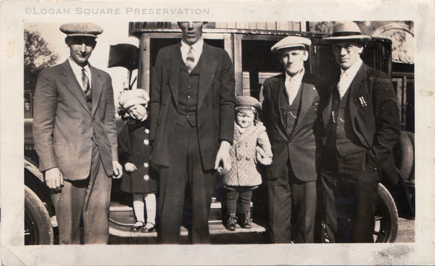 Snapshot photo of Klaus Tangeros (in cap) holding hand of son Kermit Tangeros (checkered coat) standing on running board of automobile with other men and child, circa spring 1928Photograph Details