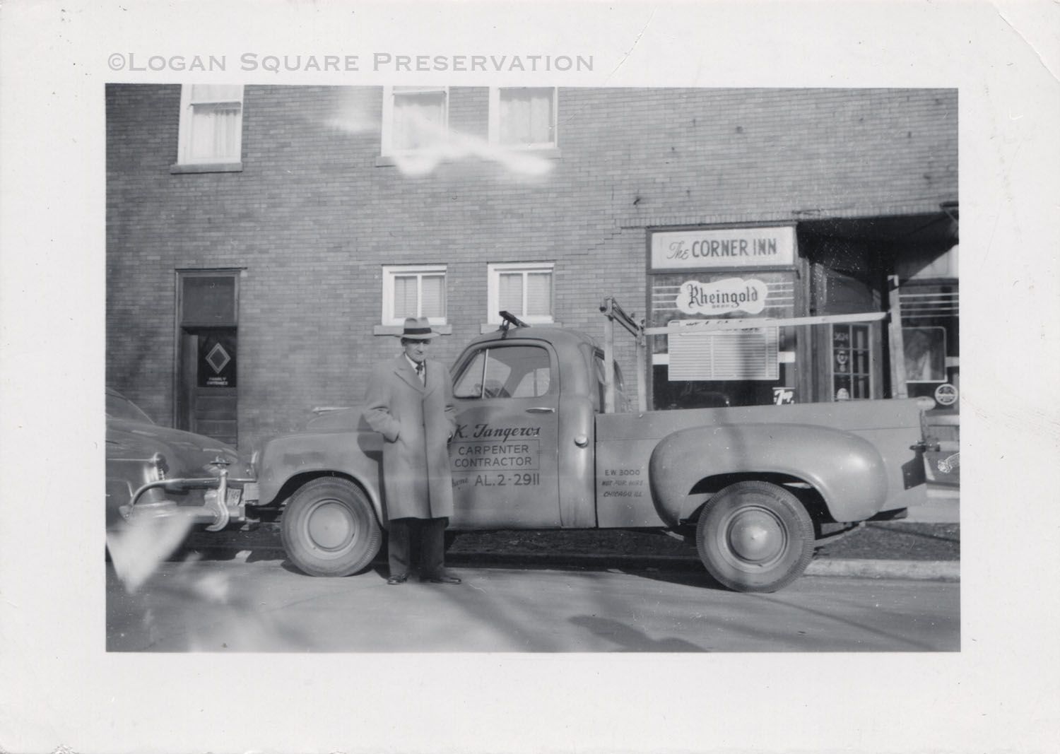 Snapshot photo of Klaus Tangeros standing next to his work truck parked in front of The Corner Inn tavern, circa early 1950sPhotograph Details