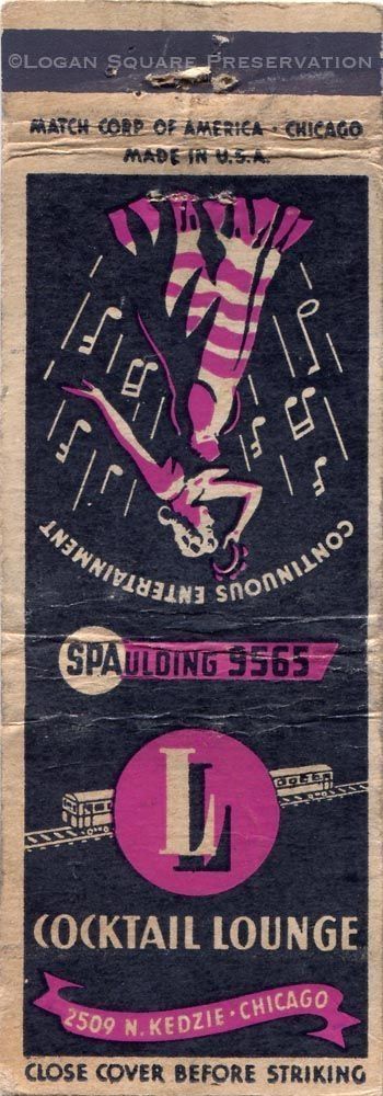 1.5" matchbook printed in purple and black ink with illustration of train car behind L in circle on front, illustration of woman playing tambourine surrounded by notes on back, circa 1930sPublication Details