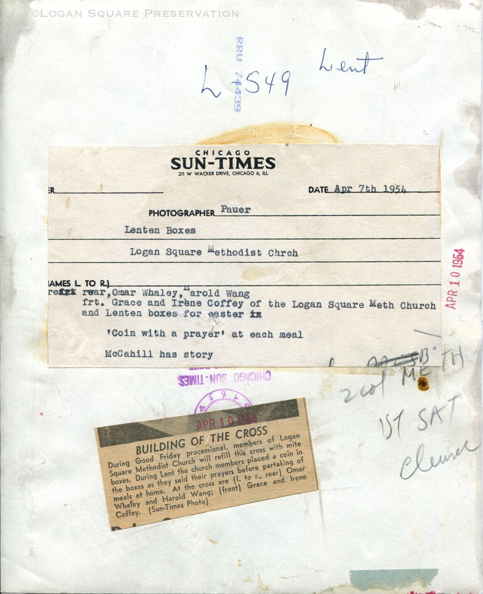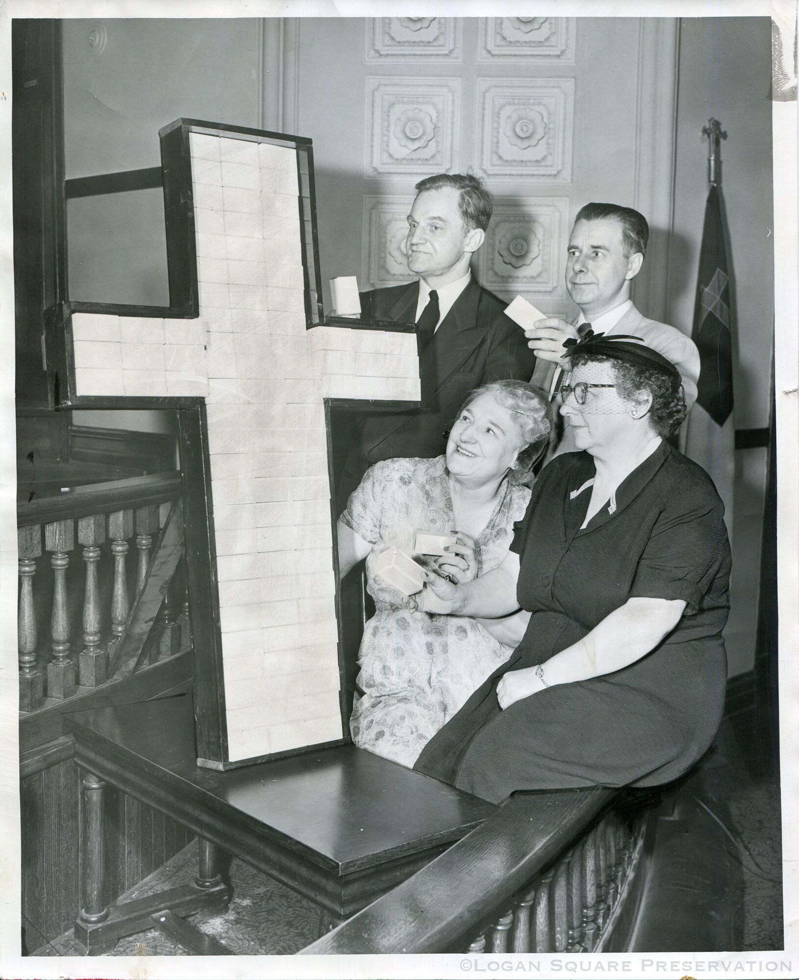 News photo of Grace & Irene Coffey, Omar Whaley & Harold Wang placing cardboard Lent collection boxes in cross-shaped frame, April 7, 1954Photograph Details