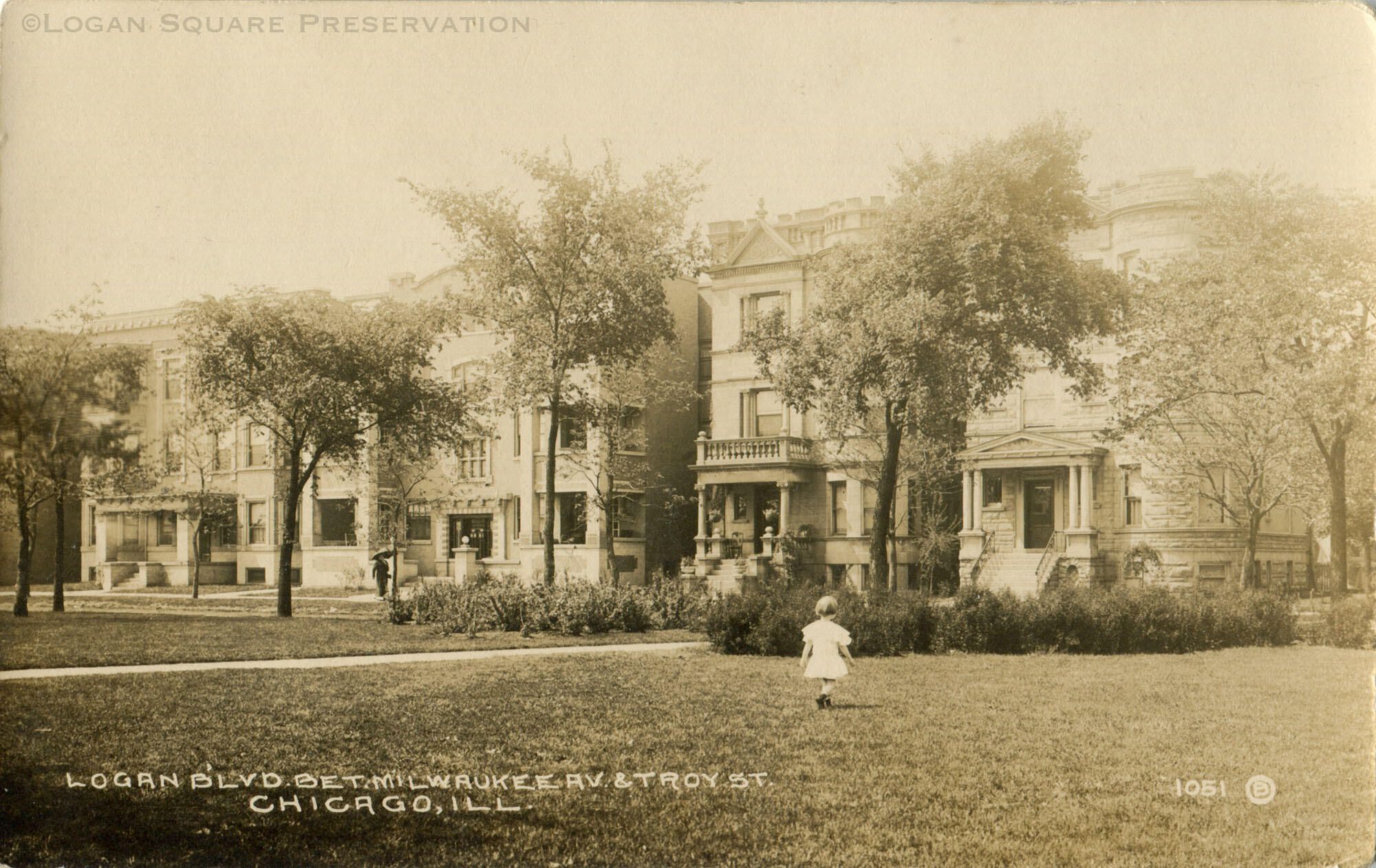 Real-photo postcard view looking north across boulevard to houses at 3134 to 3148-50 W. Logan Blvd, circa 1911Subject