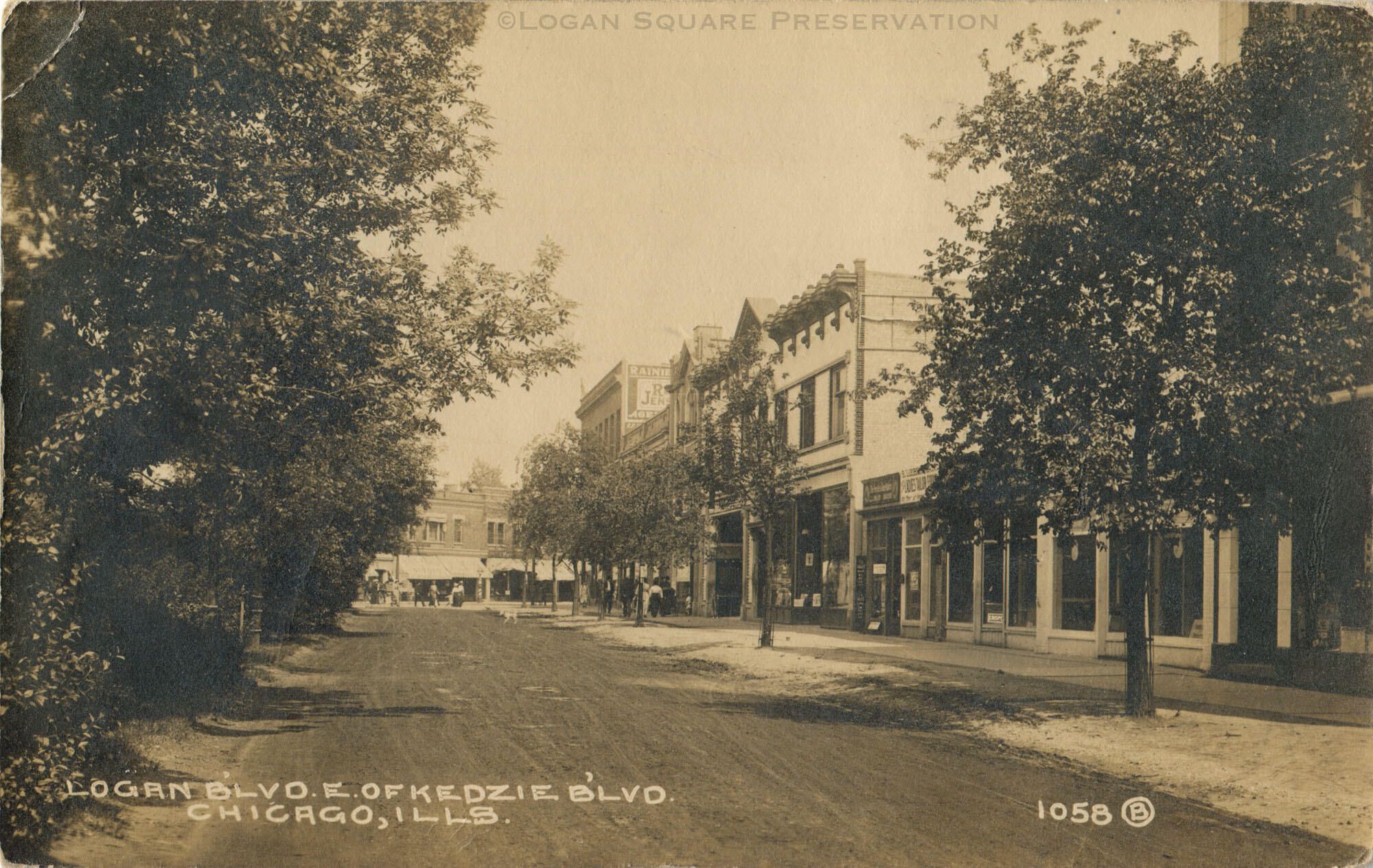Real-photo postcard view of Victoria Theater and other storefronts on south side of Logan Square from Kedzie to Milwaukee Ave, circa 1910Subject