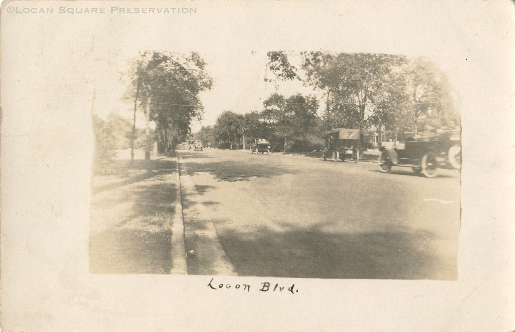 Real-photo postcard view of auto traffic on Logan Boulevard, circa 1913Subject