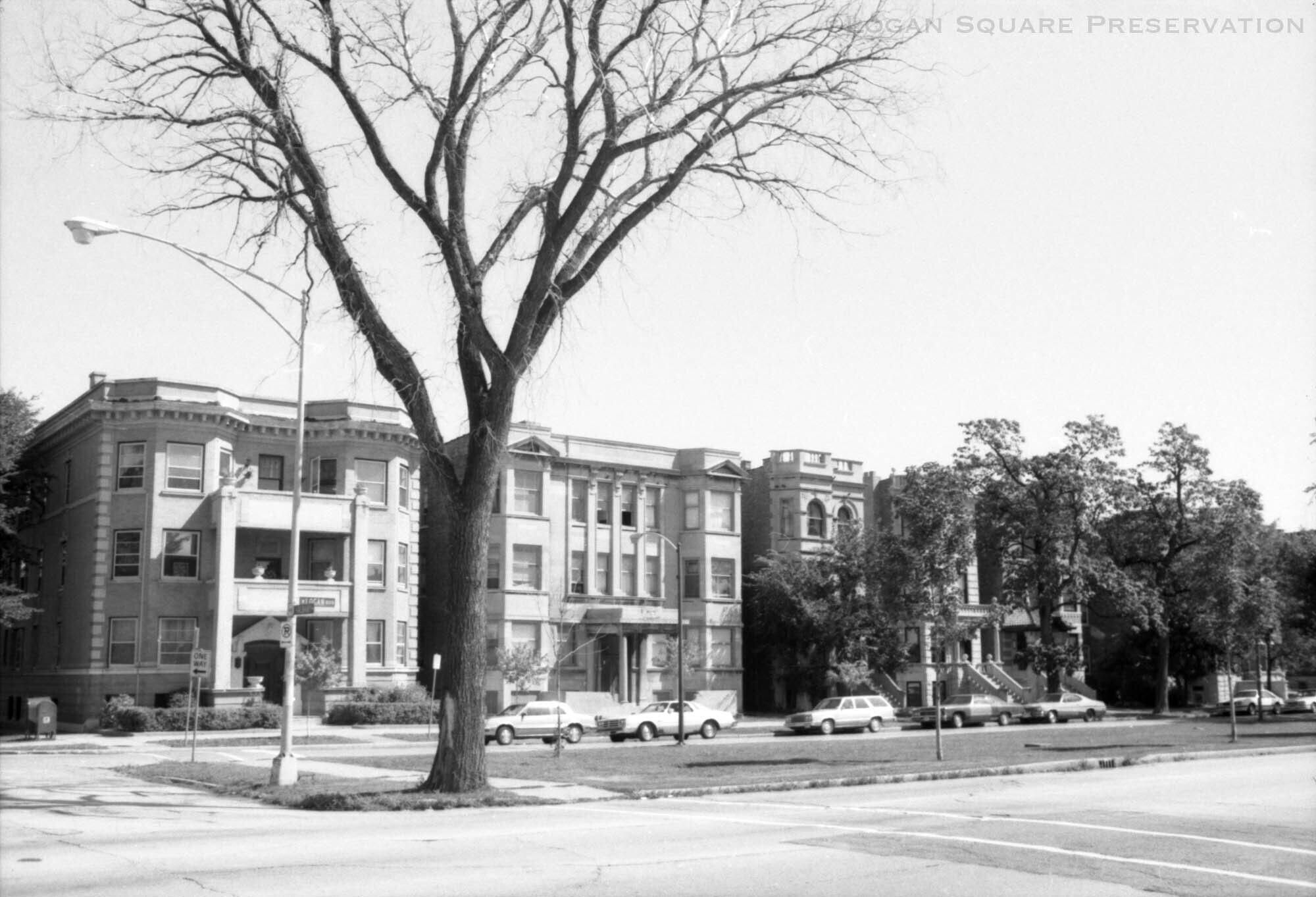 News photo image looking northeast across Logan Boulevard at Albany Ave to apartments on north side of boulevard. Taken for Aug 13, 1985 Sun-Times article about new designation of Boulevard Historic DistrictPhotograph Details