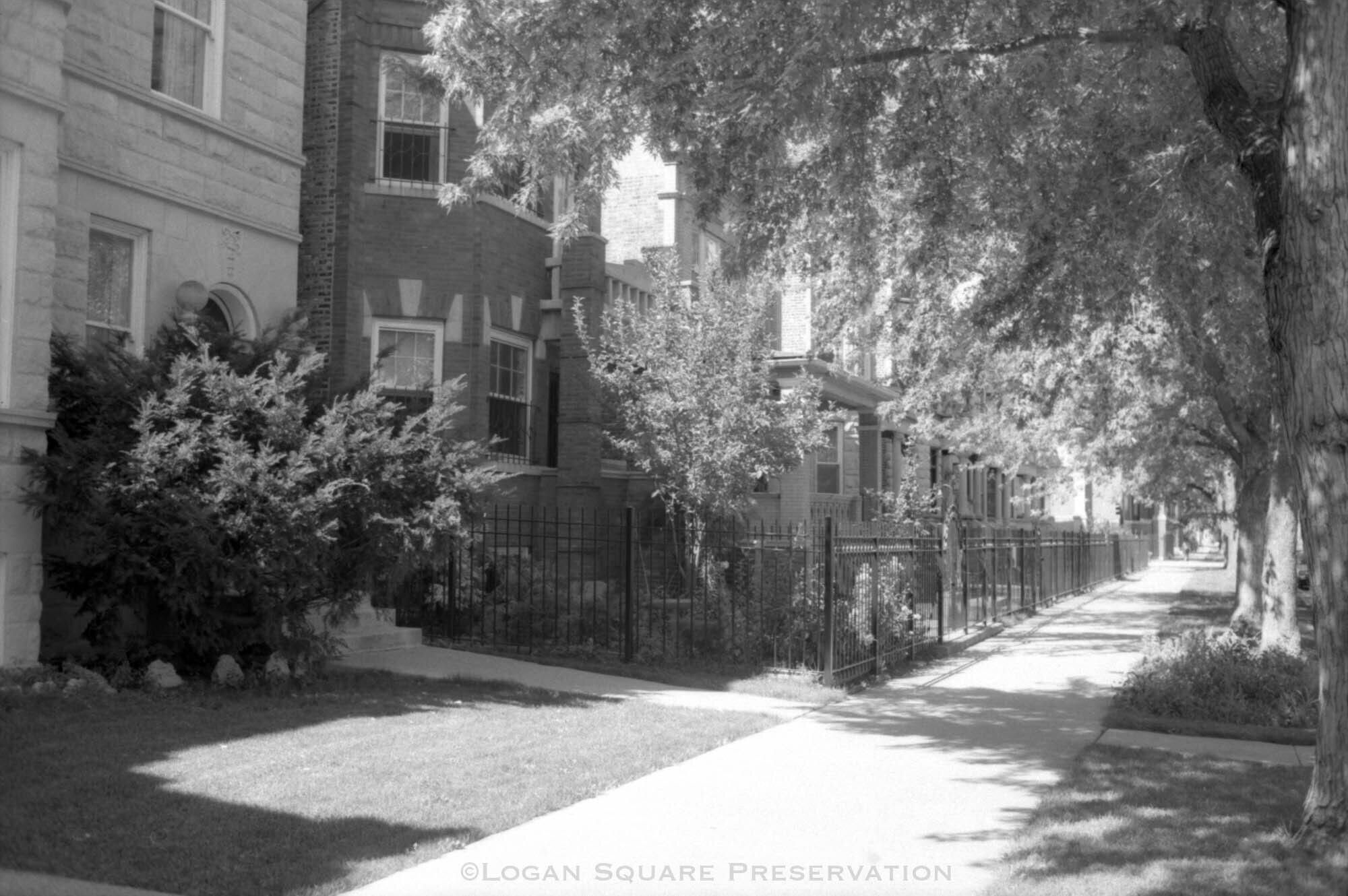 News photo image looking west down sidewalk in front of apartment buildings on south side of 2901 block of Logan Boulevard, taken for Aug 13, 1985 Sun-Times article about new designation of Boulevard Historic DistrictPhotograph Details