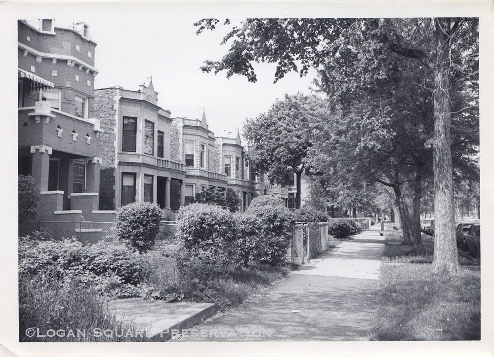 News photo looking west down sidewalk at row of two-flats on 2841 block of Logan Boulevard in summer, circa 1970s-1980sPhotograph Details