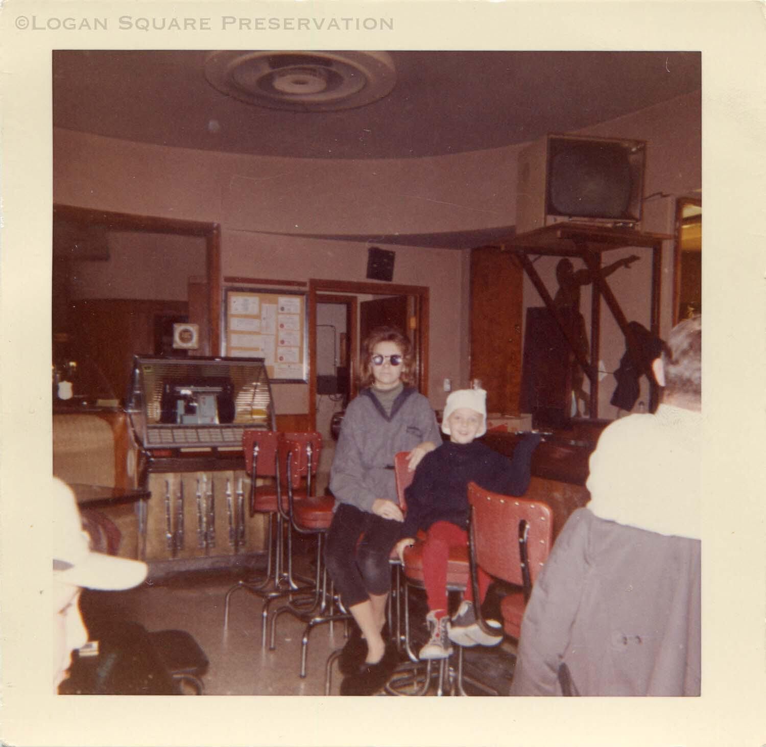 Snapshot photo of woman and child sitting on red upholstered stools at bar near jukebox, printed November 1961Photograph Details