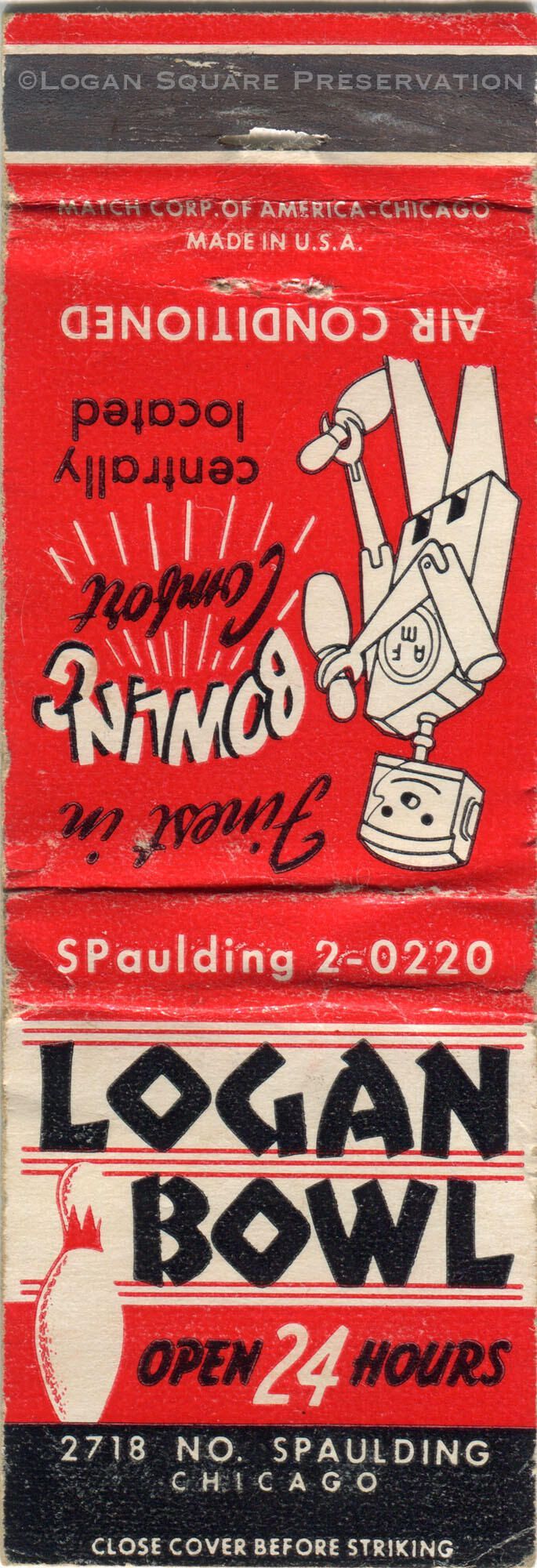 1.5" red and black matchbook cover with illustration of robot pinsetterPublication Details