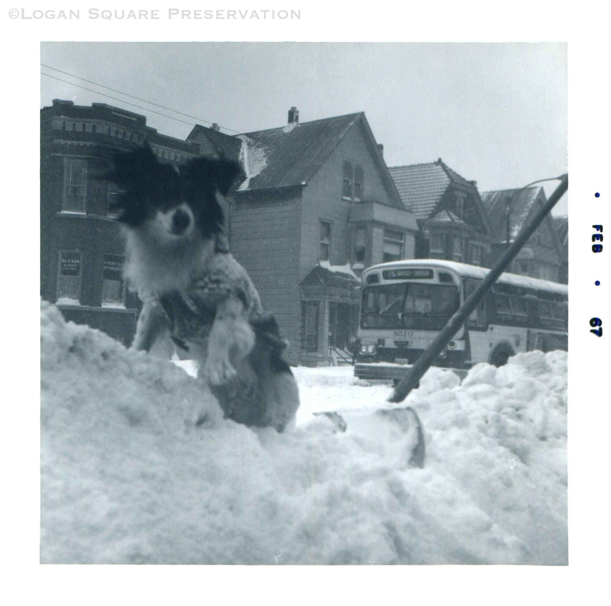 Snapshot photo of dog atop pile of snow along street with eastbound Diversey bus in background, after January 1967 blizzardPhotograph Details