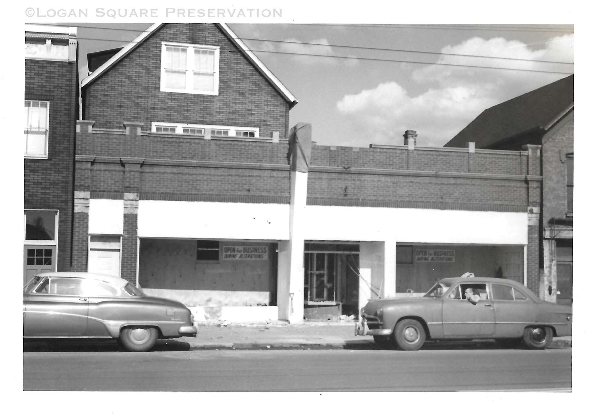 Snapshot photo showing newly-built facade during remodelling and modernization of Logan Hardware double storefront, 1953Photograph Details