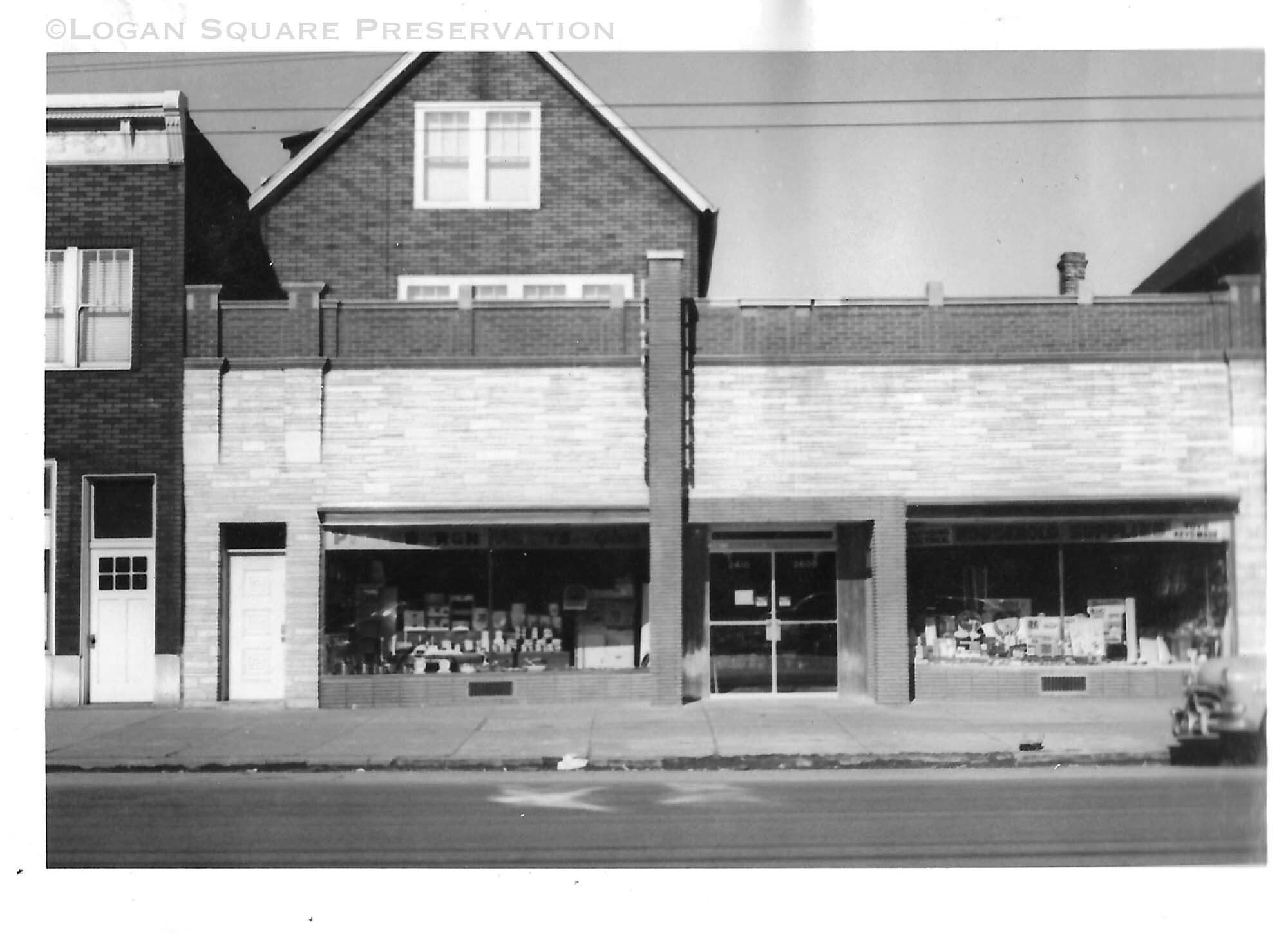 Snapshot photo showing newly-completed fieldstone facade and items on display in store window after remodelling and modernization of Logan Hardware double storefront, 1953